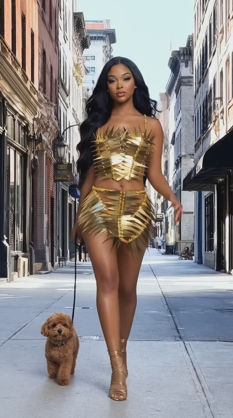 A fearless, high-shine statement designed for the boldest entrances. Aurex Blade Set 🚚 Ships in 1 Business Day features sculptural gold mirrored blade embellishments layered over a nude mesh corset top and paired with metallic gold stretch shorts for a sleek, second-skin fit. This set is unapologetically striking—built to catch light, command attention, and own the room.