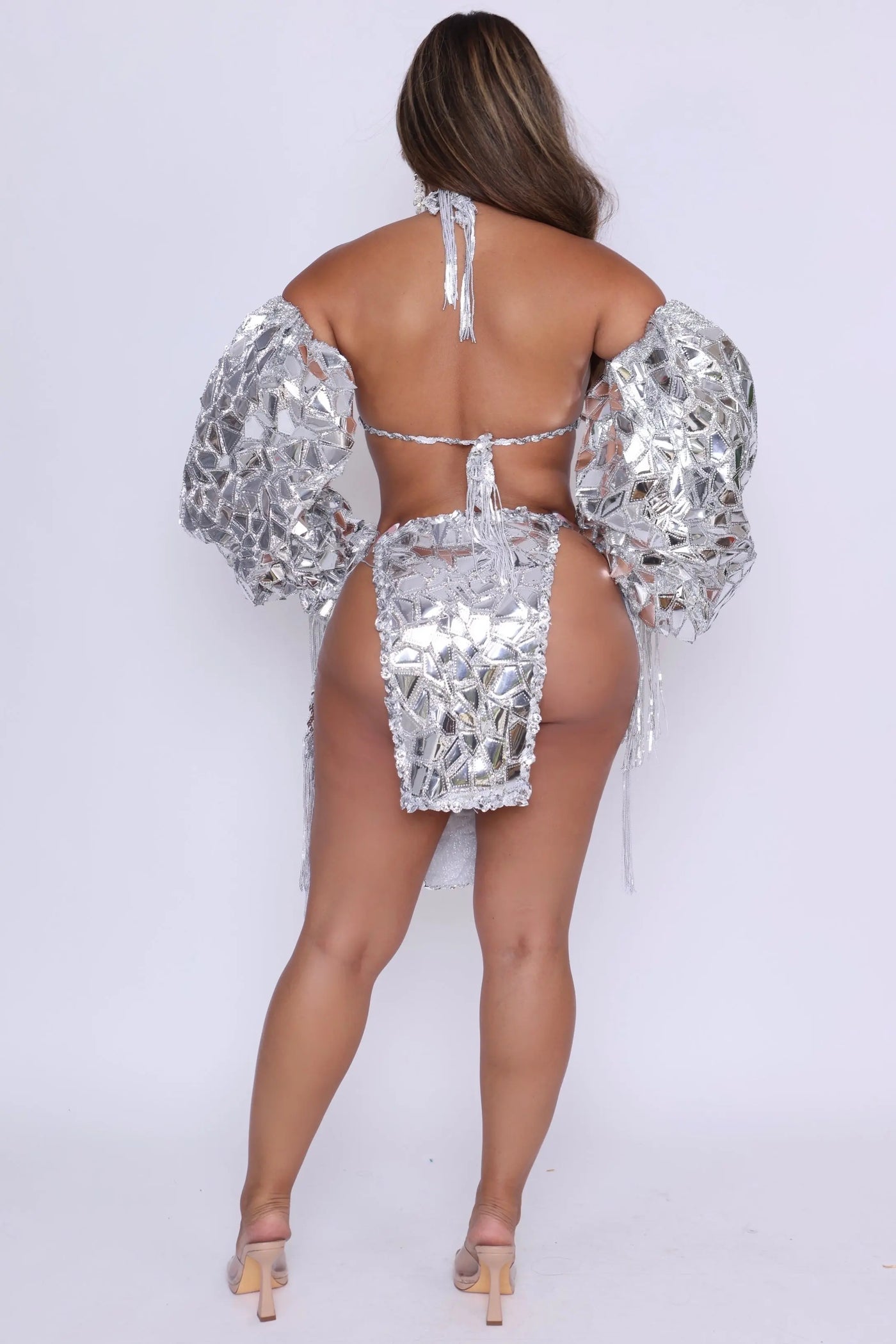Turn heads and steal the show with Banknote — a daring four-piece set crafted for fearless fashionistas. Featuring a bikini-style bra, adjustable tie-up mini skirt, and dramatic oversized sleeves, this statement-making outfit shimmers with silver sequin-like material. Designed for bold entrances and unforgettable exits, Banknote is all about commanding attention.