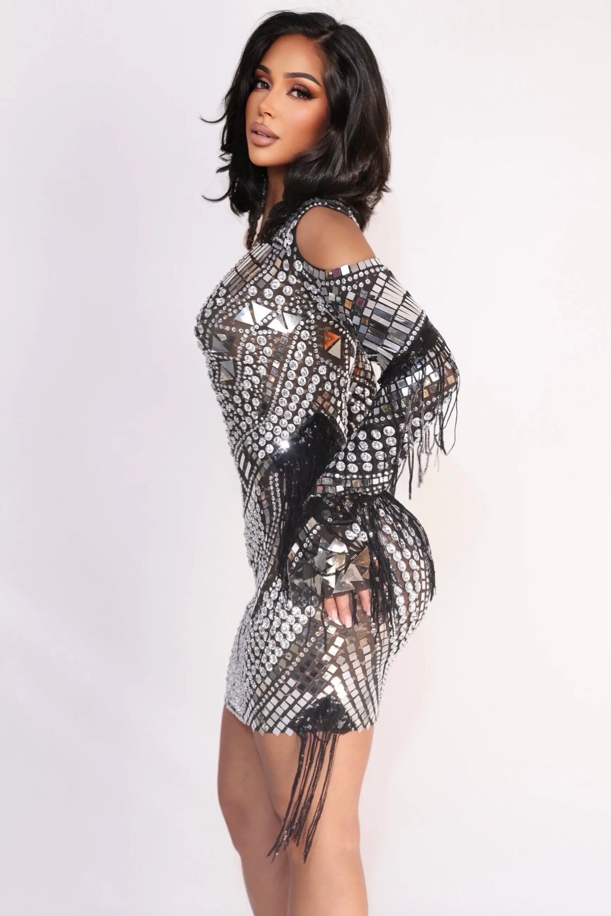 Step into pure decadence with Black Opulence, a show-stopping mini dress designed to command attention from every angle. This striking silhouette features an illusion mesh base layered with intricate silver and black embellishments in geometric patterns that contour the body beautifully. Dramatic fringe detailing adds movement and drama, creating a mesmerizing effect with every step.