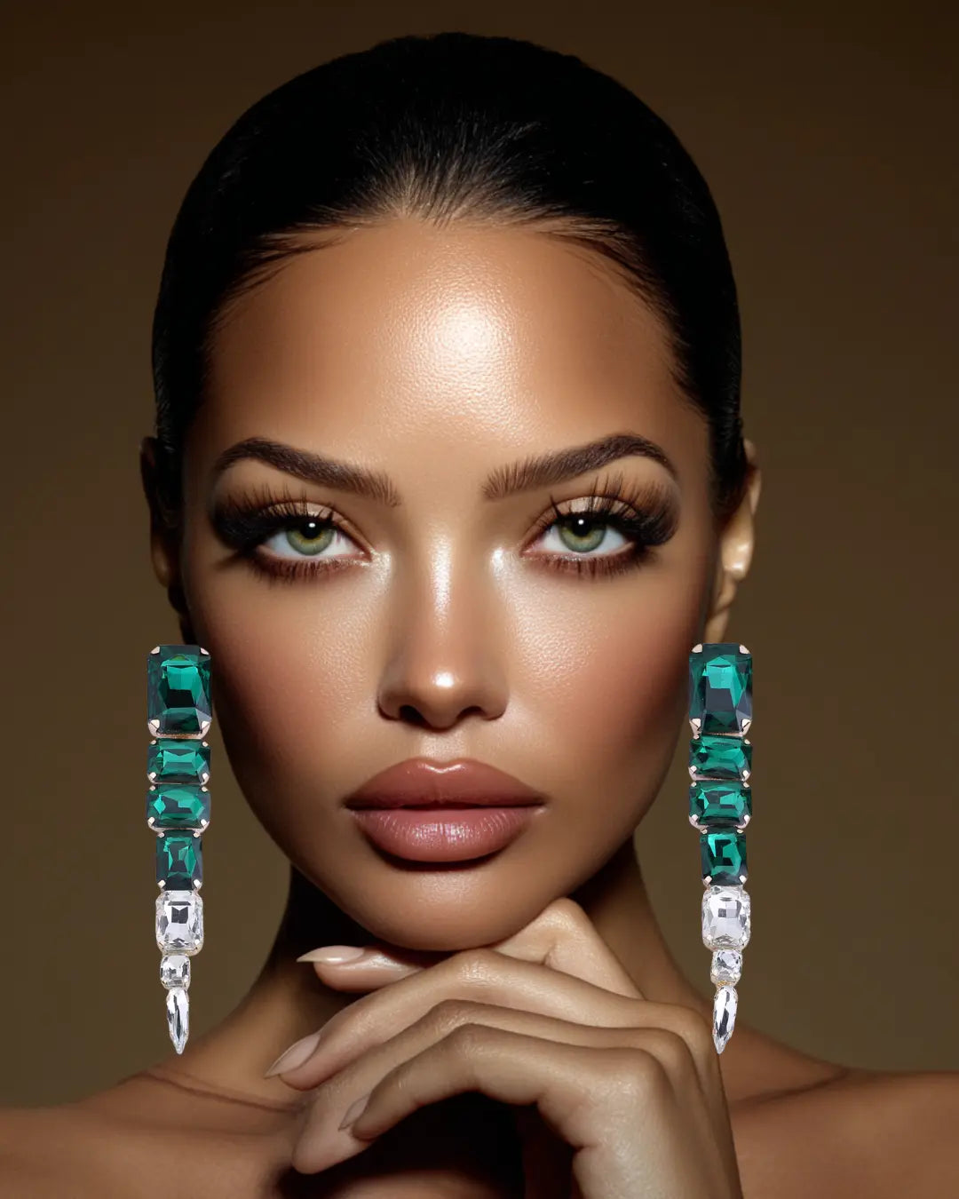 Pair E-229 with slick hair, a deep part, or a clean updo to highlight the full length and crystal detailing. Gorgeous with matching tones or worn as a bold pop against black, white, or neutral outfits.