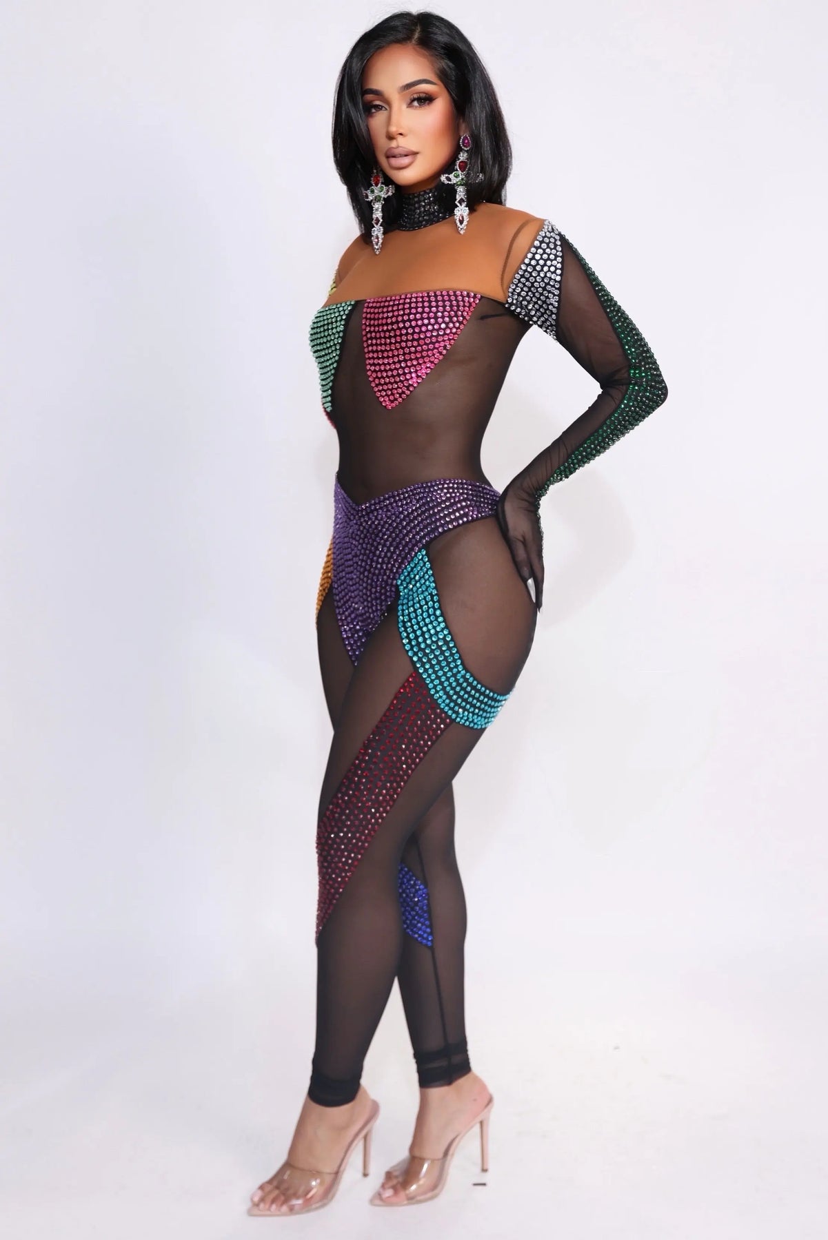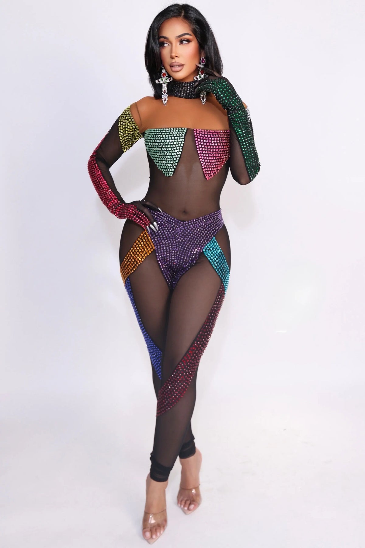 A mesmerizing, body-sculpting jumpsuit designed to sparkle from every angle. Kaleidoscope Temptation features a sheer black stretch mesh base adorned with vibrant, multi-colored crystal panels strategically placed to contour the body and accentuate curves. This daring silhouette blends illusion mesh with rich jewel-tone embellishments, creating a statement look that’s equal parts seductive and artistic.