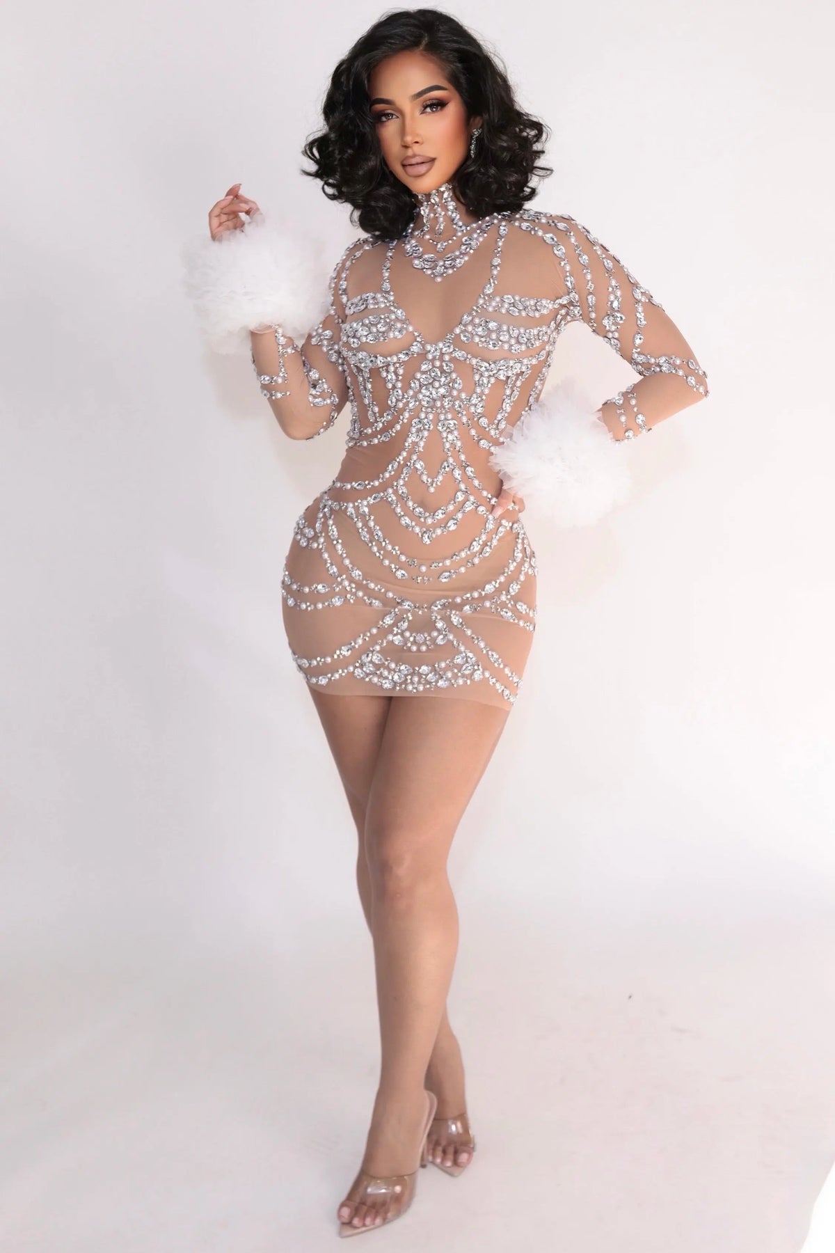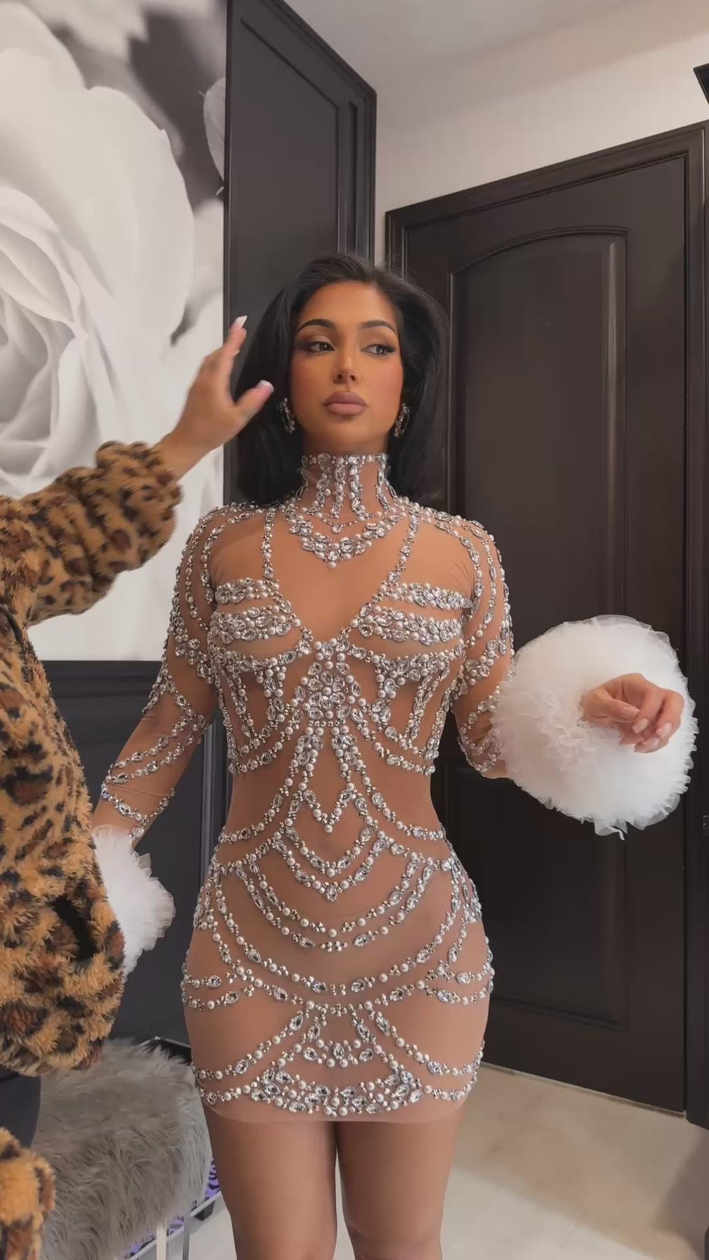 The White Diamond Doll is a dazzling couture mini designed to sparkle from every angle. Crafted on a nude illusion stretch mesh base, this body-hugging dress is fully adorned with intricate silver crystal embellishments arranged in sculpting, jewelry-inspired patterns that contour the bust, waist, and hips.