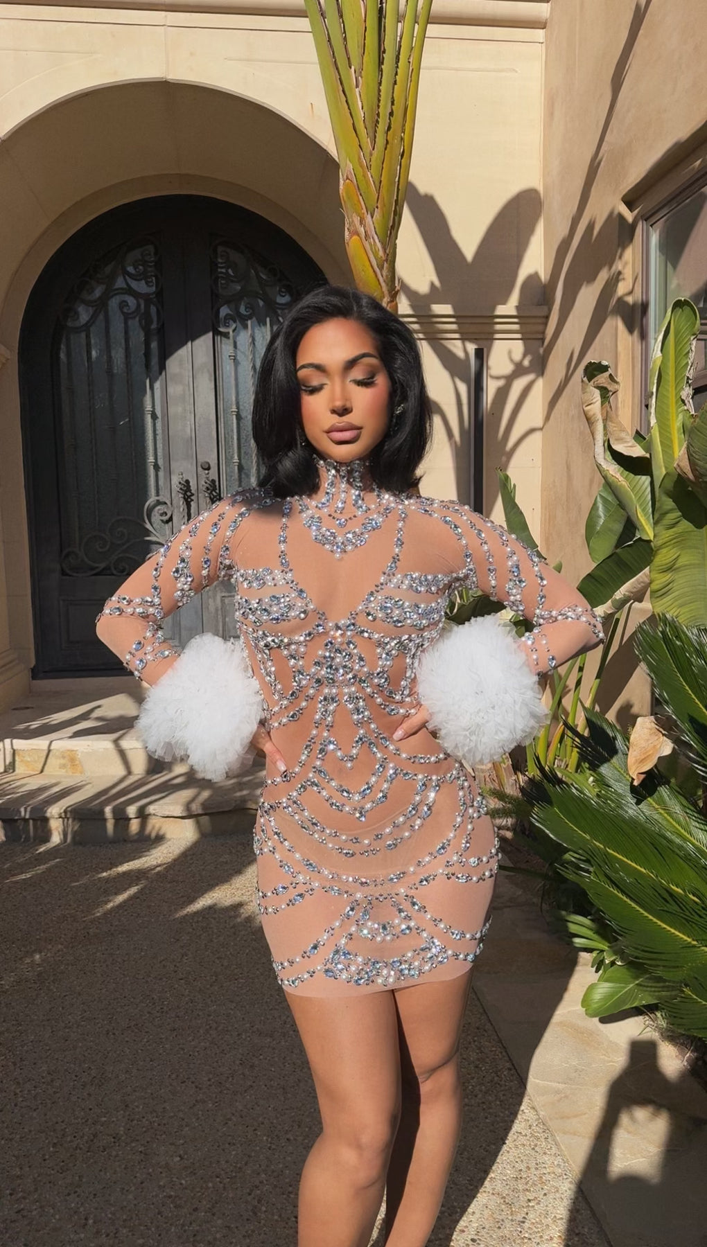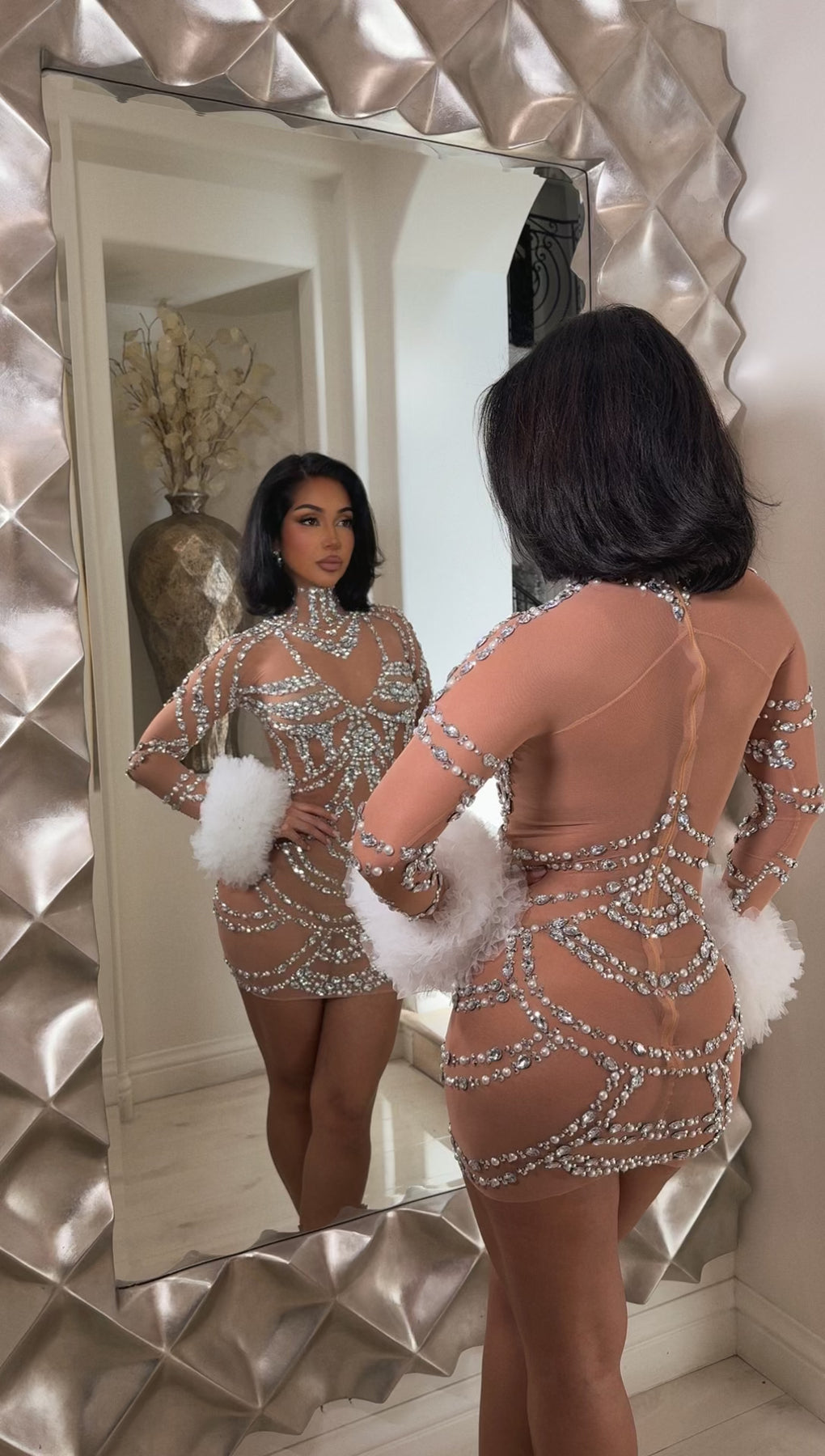The high illusion neckline and long sleeves add elegance and balance to the ultra-glam silhouette, while the dramatic white feather cuffs at the wrists bring a playful, show-stopping finish. Each crystal strand is carefully placed to enhance the body’s natural curves, creating a radiant, barely-there illusion with maximum impact.