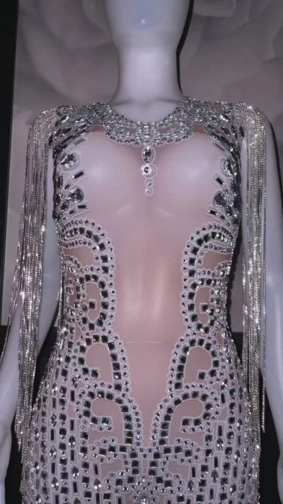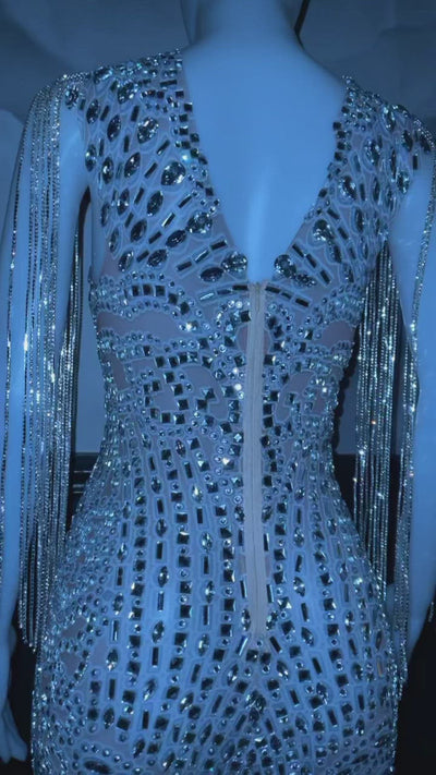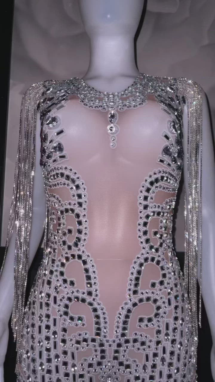 Fit for a Queen this dress is one you need look no where else. This dress is ankle length with rhinestone fringes on the sleeve also stone detail in front and back of dress.