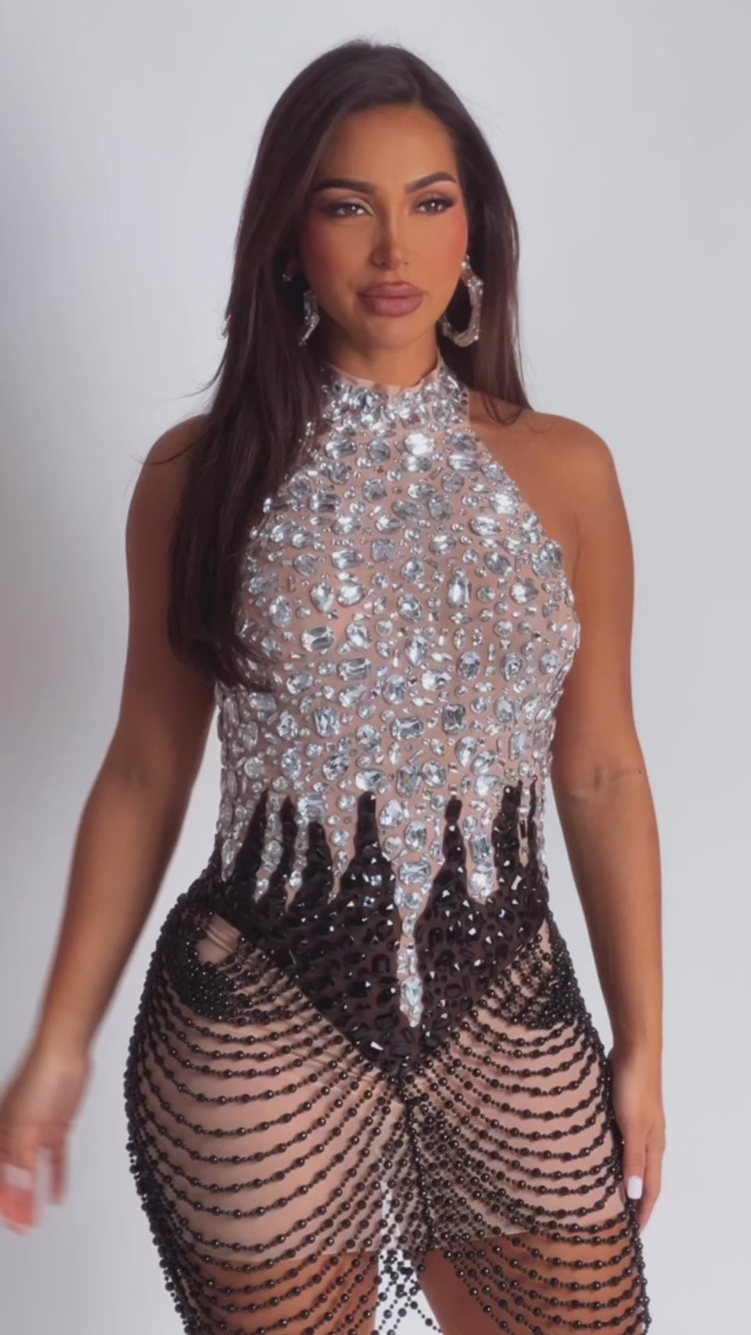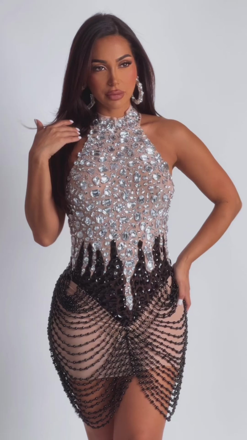 Turn every head in the room with Lustre Dream—a dazzling halter mini dress that blends shimmer, sensuality, and high-fashion edge. Featuring a mesh base with silver and black stones and draped pearl strands, this dress is made to sparkle with every movement. The high neckline closes with secure buttons, while the open back and body-hugging fit create a seductive silhouette that demands attention. Delicate black beaded fringe cascades across the hips in dramatic waves, giving it that elegant flapper-meets-modern-goddess energy.
