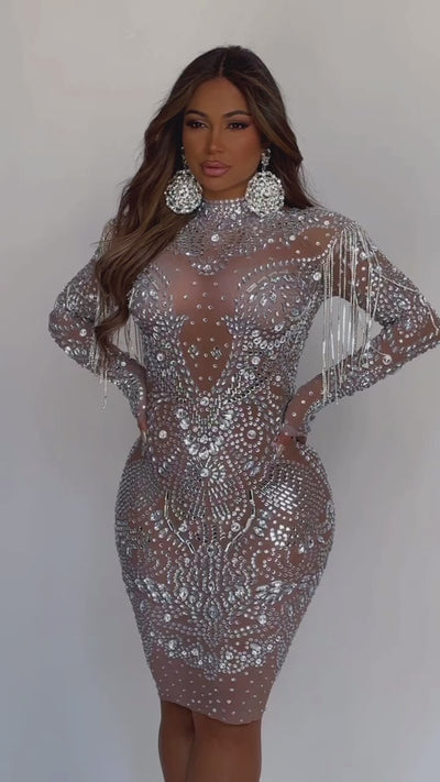 Who needs a Prince Charming when you already are the princess? This regal yet daring dress is made for the woman who commands attention, sparkles with confidence, and knows she doesn’t need saving—just a spotlight. Featuring a transparent mesh base with an airbrushed design and mock cleavage, this long-sleeve beauty is adorned with rhinestones, crystal fringe, and chain embellishments that shimmer with every step.