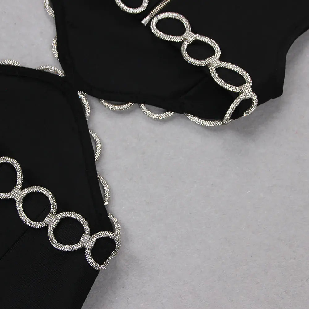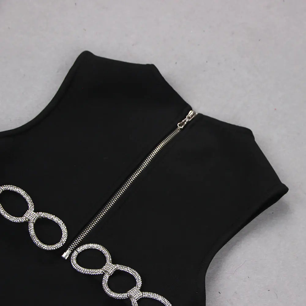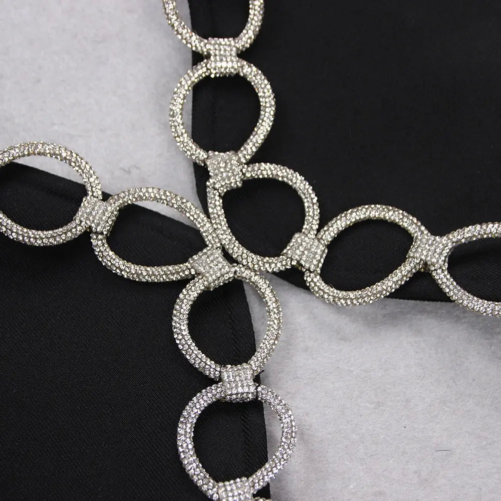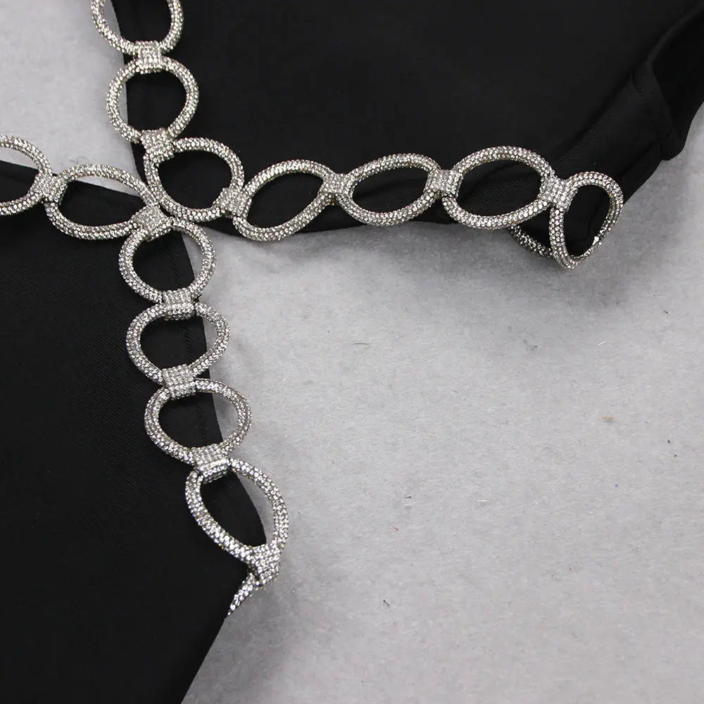 - Features a stretchy bandage material, with embellished links around the waist cut-out.