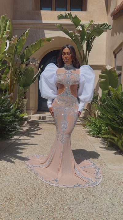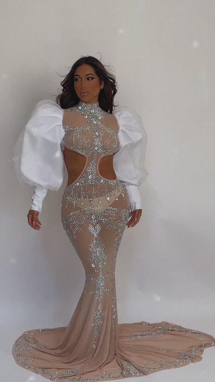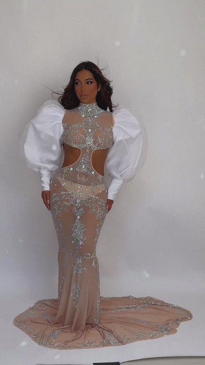 Step into stunning harmony with Synchrony, a breathtaking nude printed mesh gown adorned with a shimmering silver design and delicate rhinestone embellishments. The dramatic oversized puffy sleeves, elegant turtleneck, and sultry open back make this piece a work of art from every angle. With a mermaid silhouette and train that glides behind you, Synchrony flows as beautifully as it fits.