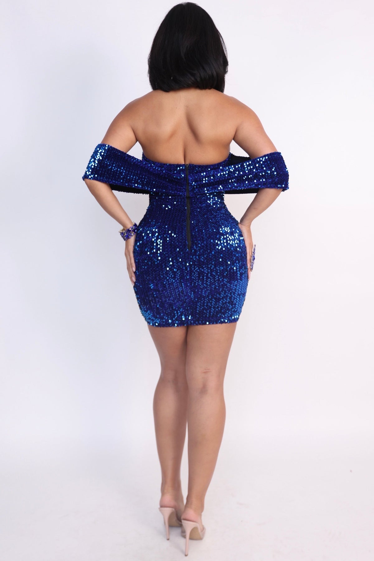 Command the room in L606, a breathtaking off-the-shoulder mini dress designed to shimmer with every step. This striking silhouette is fully adorned in deep sapphire sequins that catch the light from every angle, delivering unapologetic glamour and red-carpet energy.