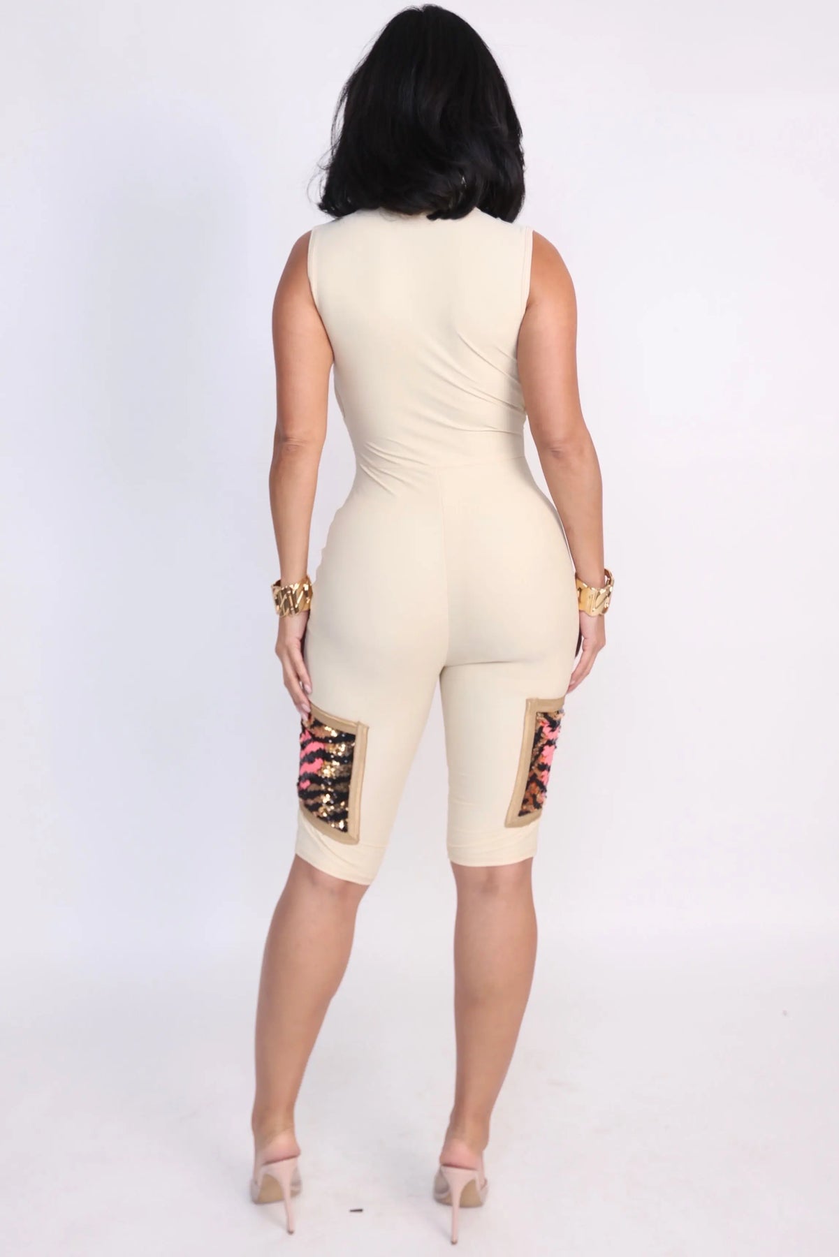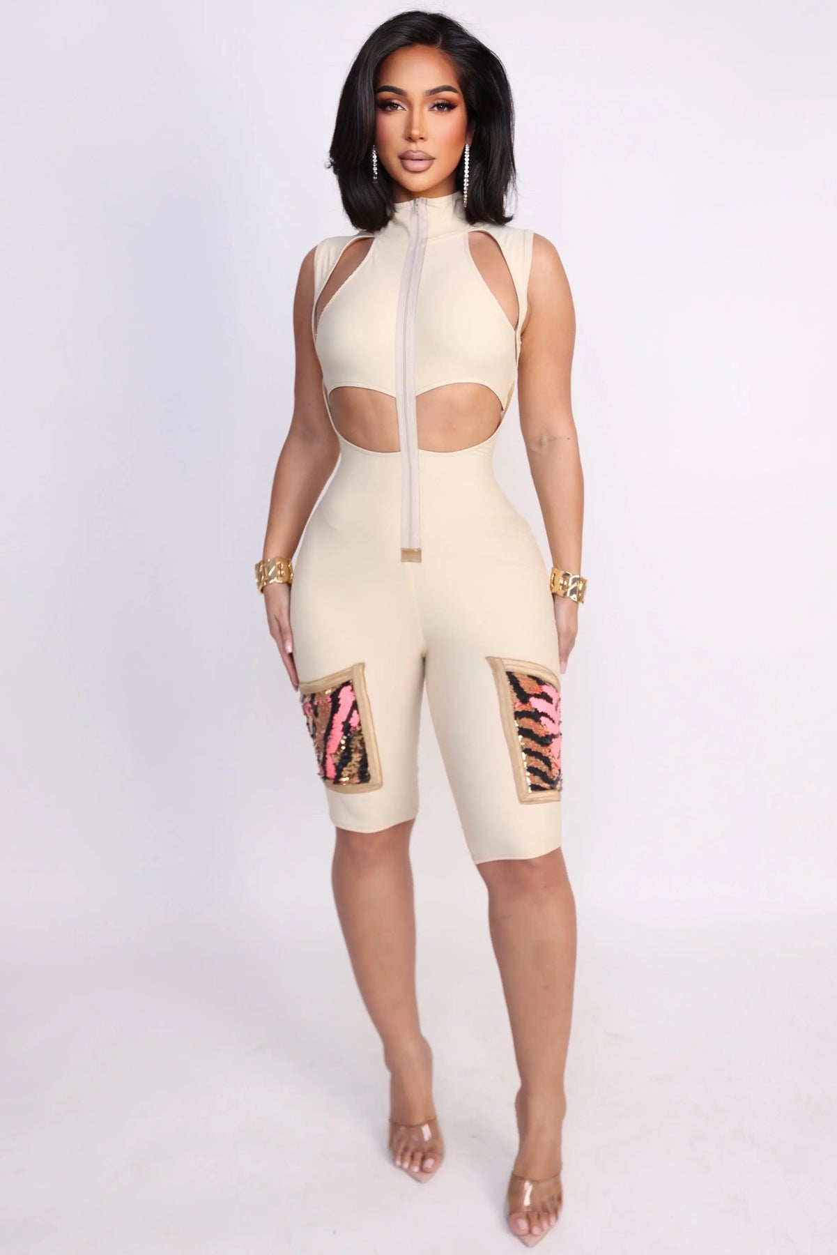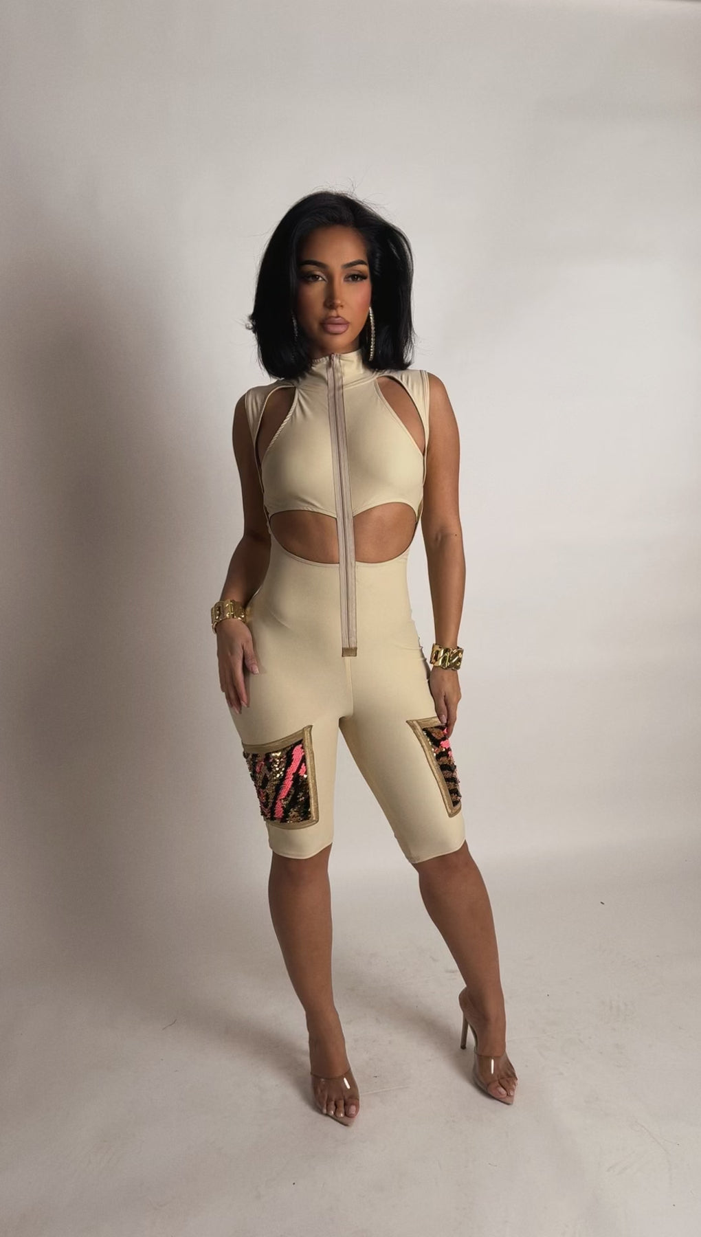 Designed to command attention, L608 is a sleek, body-contouring one-piece that blends sporty edge with elevated glamour. Featuring a high neckline, front zipper detail, and striking cut-outs at the waist, this look is all about confident curves and statement style. The fitted biker-length silhouette is finished with bold sequin panel accents at the thighs for just the right pop of attitude.