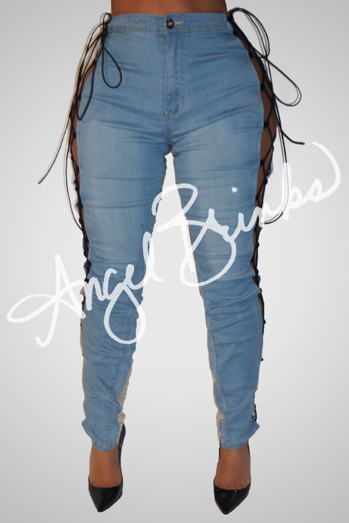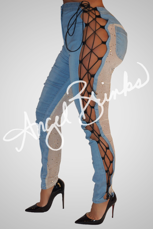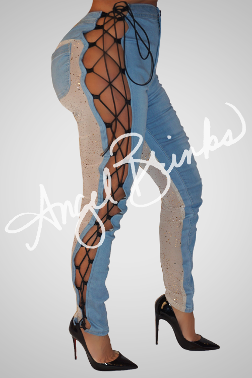 These denim jeans has an adjustable elastic rope with nude mesh in the back. Mesh is a bit see through and has gold sparkles on it. These jeans are so sexy and fun! Pair them with some cute heels and top and you are ready to go. You don't have to worry about the stretch, with this lace and adjustable rope you can adjust it to your liking.