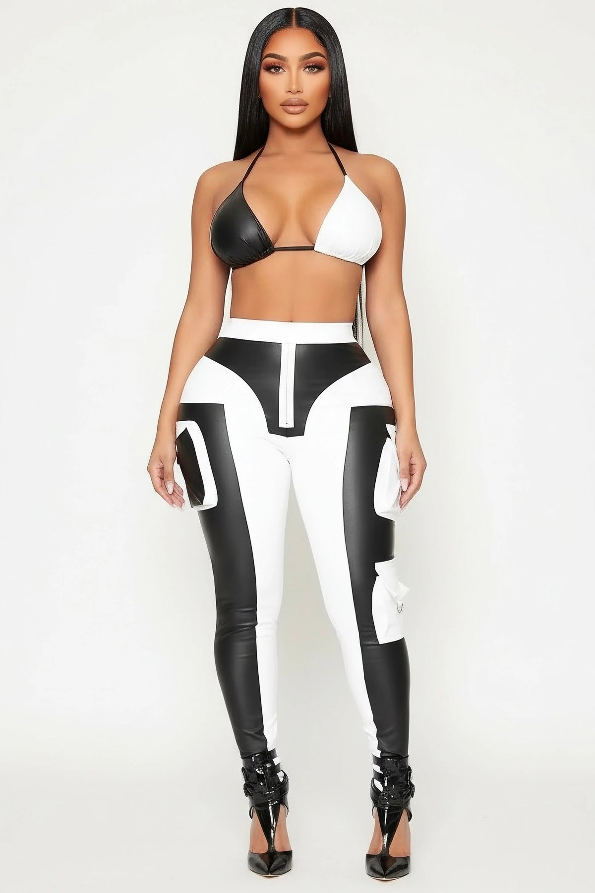 Step into the spotlight with the Black & White 2-Piece Set, one of our best-selling and most popular designs! This stunning combination features a sleek black vegan leather bikini top paired with high-waisted white Lycra pants, creating the perfect balance of boldness and elegance. Whether you're heading to a special event or a night out, this set will ensure you look and feel fabulous.