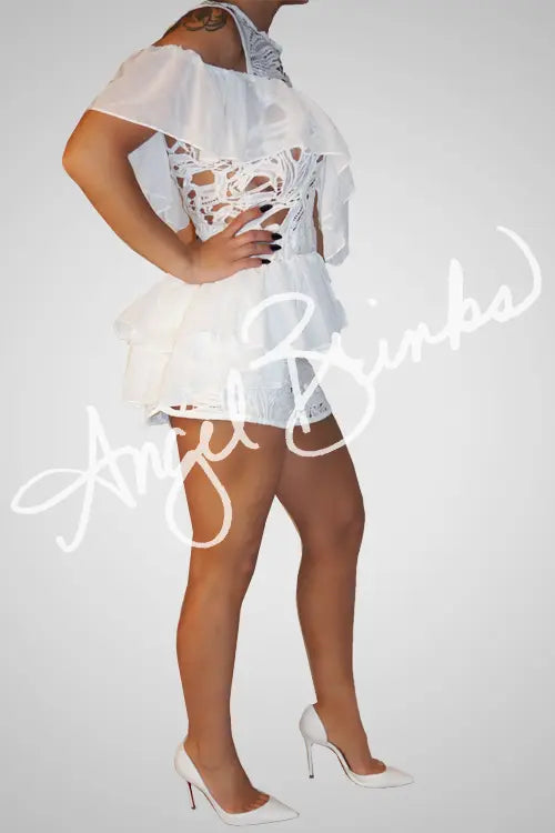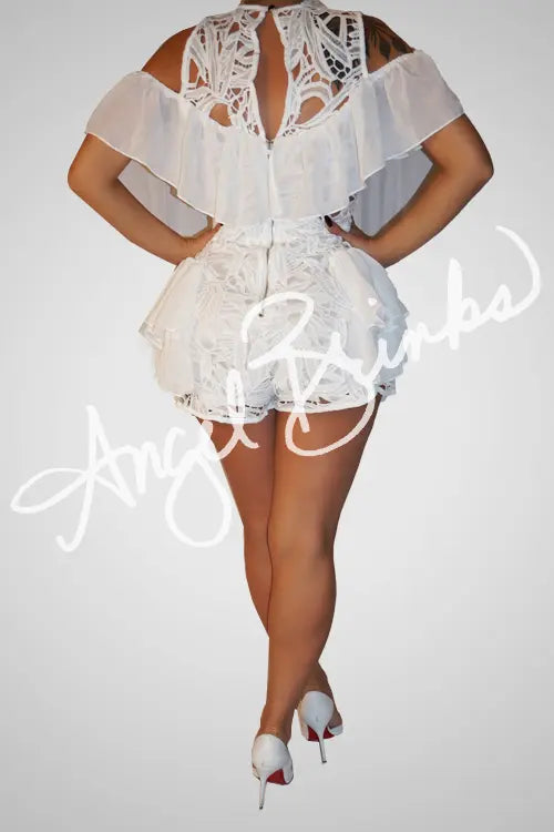 Romper featuring a crisp white hue, round neckline, a cold shoulder, lace fabric and ruffles. This piece is perfect for a day out in the sun, brunch, or any event.