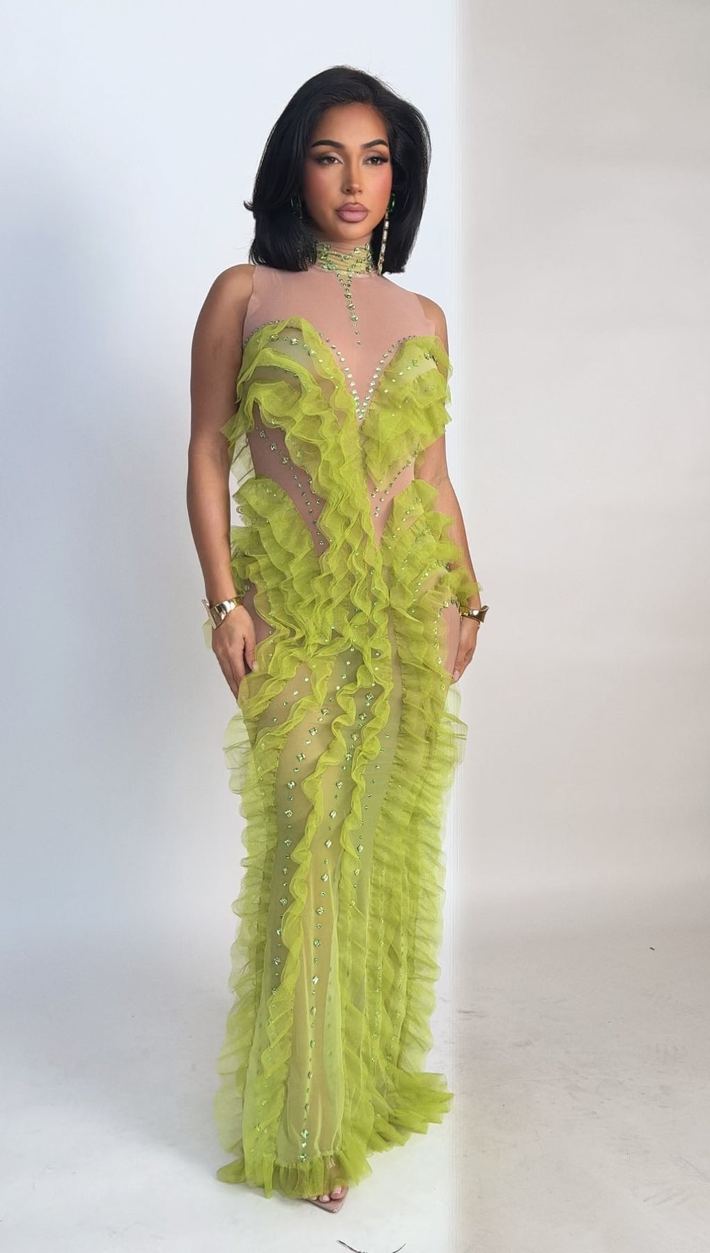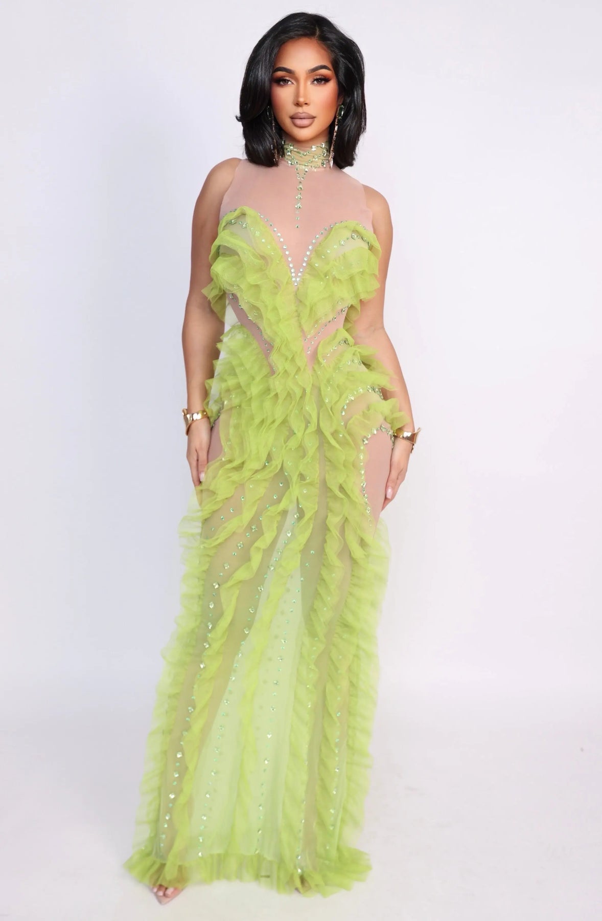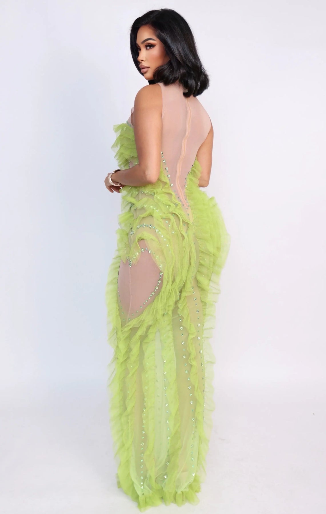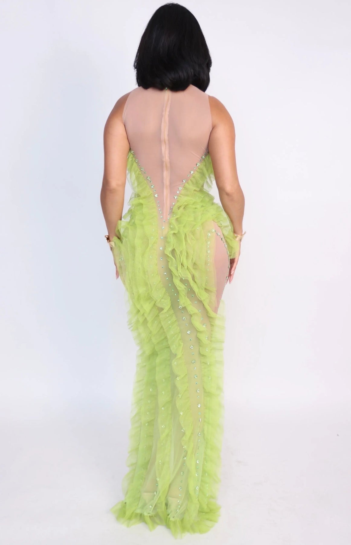 The Verdant Siren Illusion Dress is a striking statement piece designed to move with the body while sculpting every curve. Crafted on a nude illusion stretch mesh base, this gown features cascading lime-green ruffled tulle that flows vertically along the front, sides, and hem, creating dramatic movement and a fluid, elongated silhouette.