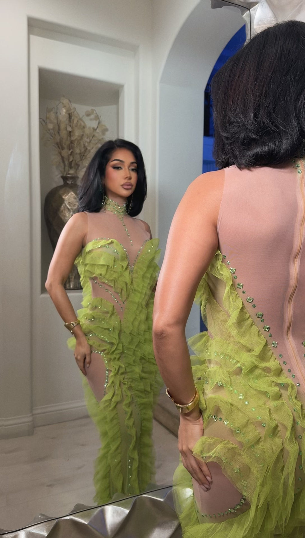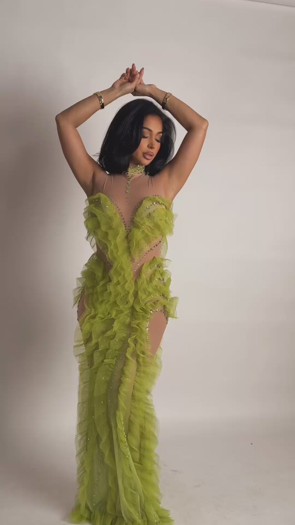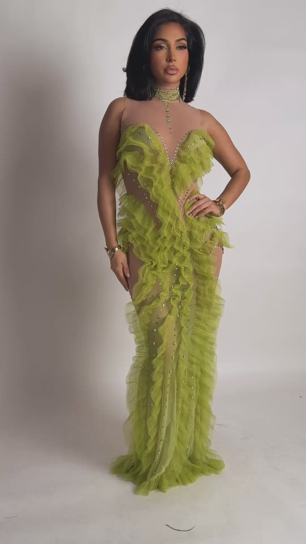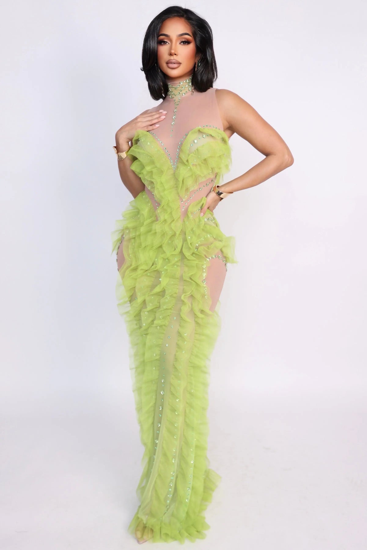 The Verdant Siren Illusion Dress is a striking statement piece designed to move with the body while sculpting every curve. Crafted on a nude illusion stretch mesh base, this gown features cascading lime-green ruffled tulle that flows vertically along the front, sides, and hem, creating dramatic movement and a fluid, elongated silhouette.