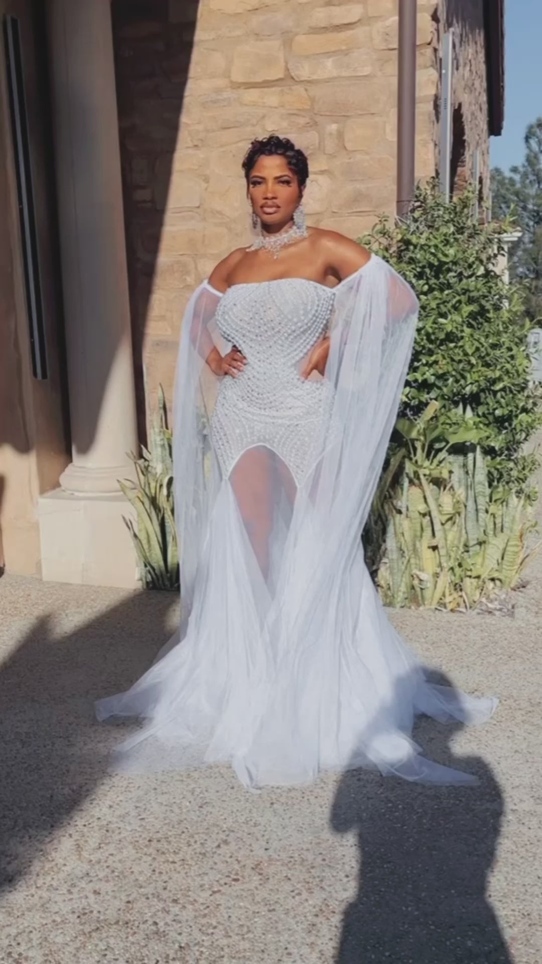 Romance meets radiant glamour. Introducing Dreamy Dazzle, the enchanting two-toned mesh dress designed to leave a lasting impression. Embellished with pearl-like stones and rhinestones, this stunner blends elegance with sparkle in all the right ways. The off-the-shoulder sleeves and sheer silhouette create a soft, romantic aura—perfect for making your fairytale entrance.