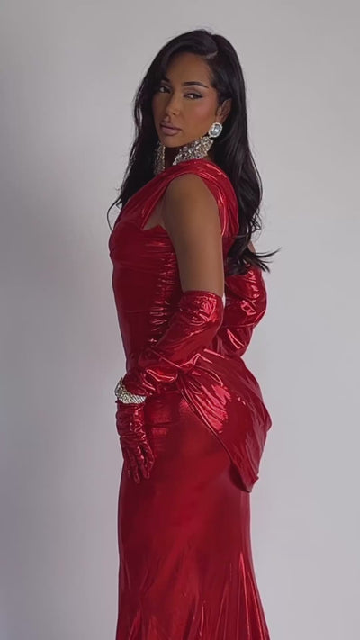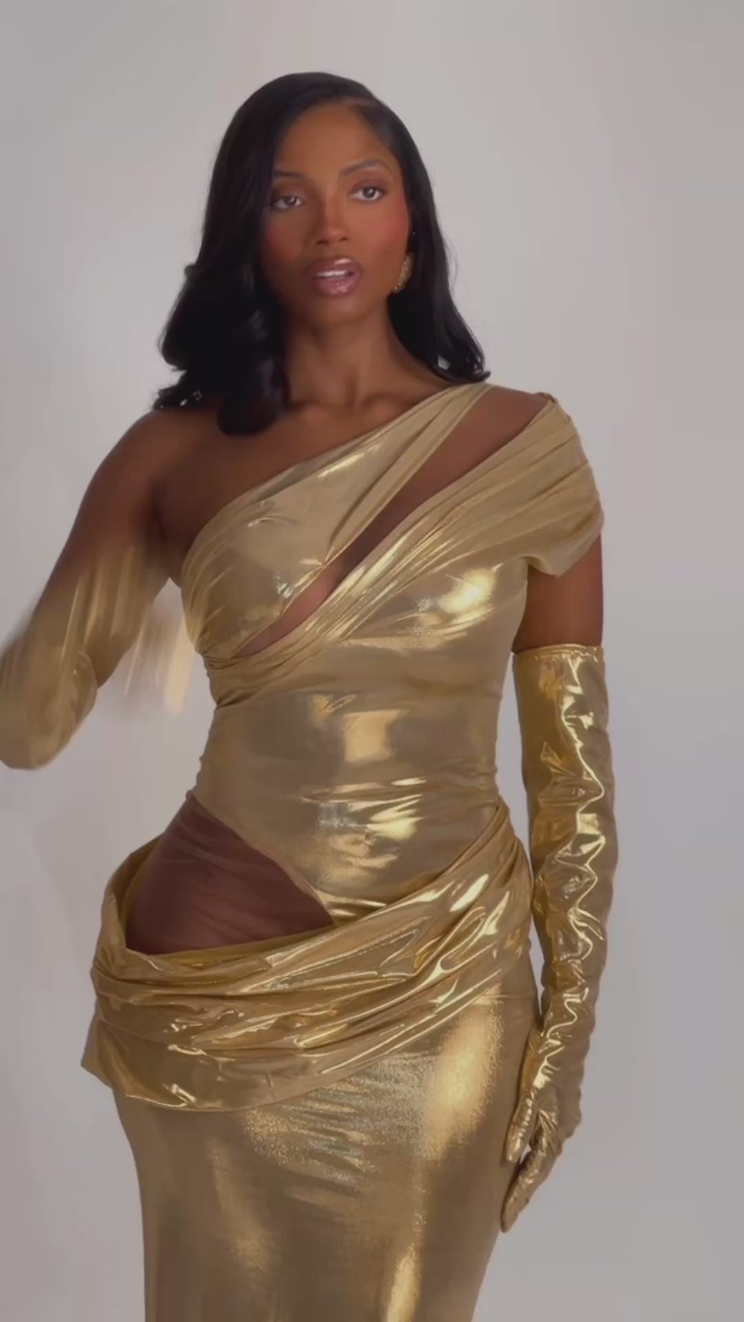 Drip in liquid luxury with this jaw-dropping metallic mermaid gown, Liquid Luxe designed to sculpt and shine like it was poured onto your body. Featuring a high-shine, liquid-effect fabric, this dress catches the light with every move for the ultimate red carpet glow. The elegant gathering detail enhances your curves, while strategic chest and hip cutouts—layered with illusion mesh—add just the right amount of sultry allure. The dramatic mermaid bottom flows beautifully, creating a show-stopping silhouette. Complete with detachable gloves for extra drama, this gown is your go-to for high-glam moments.