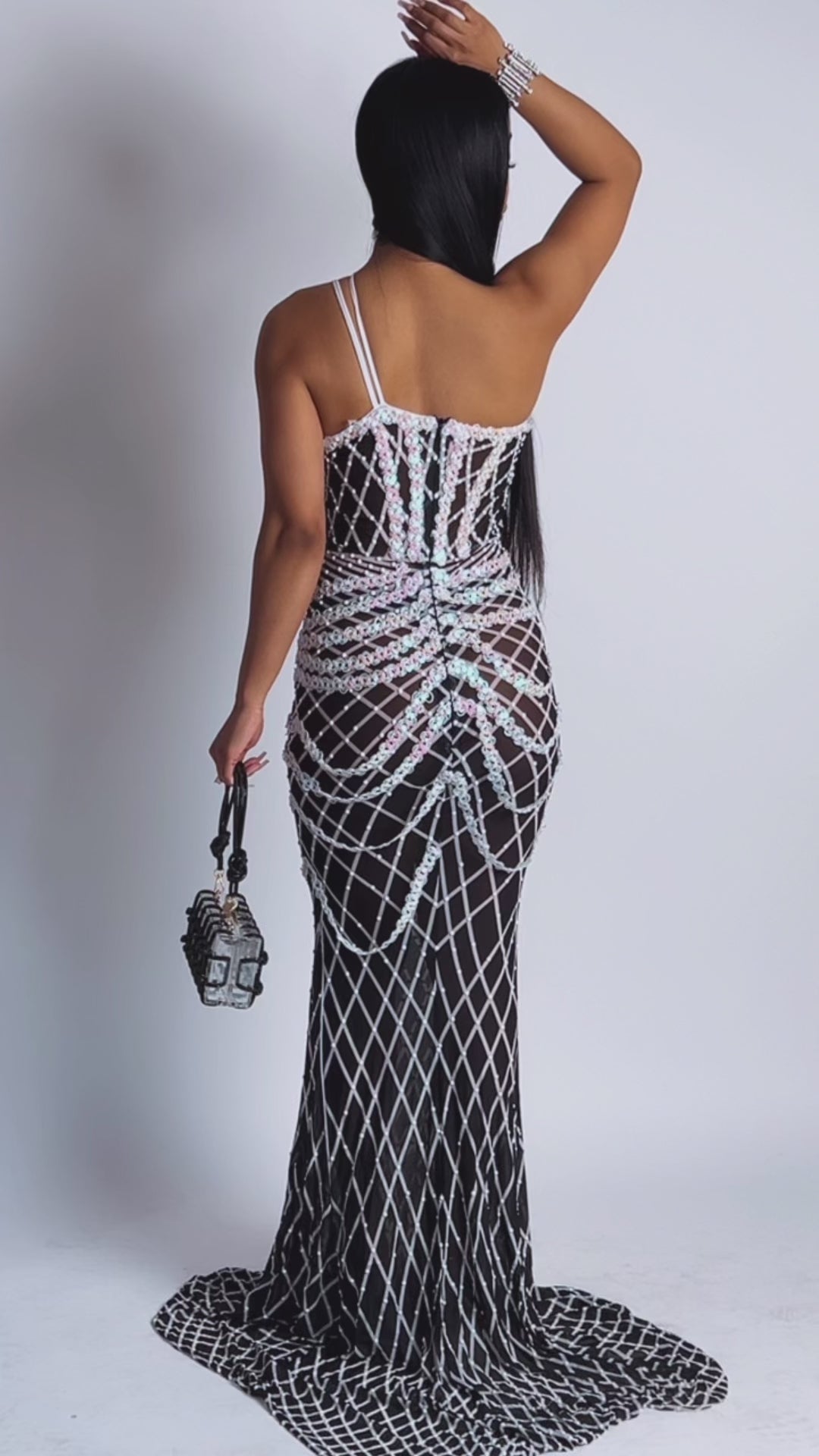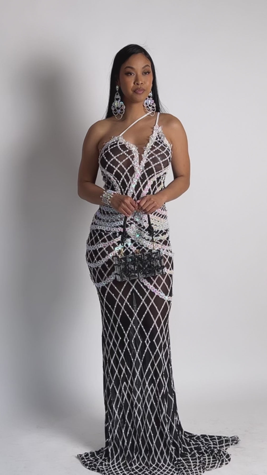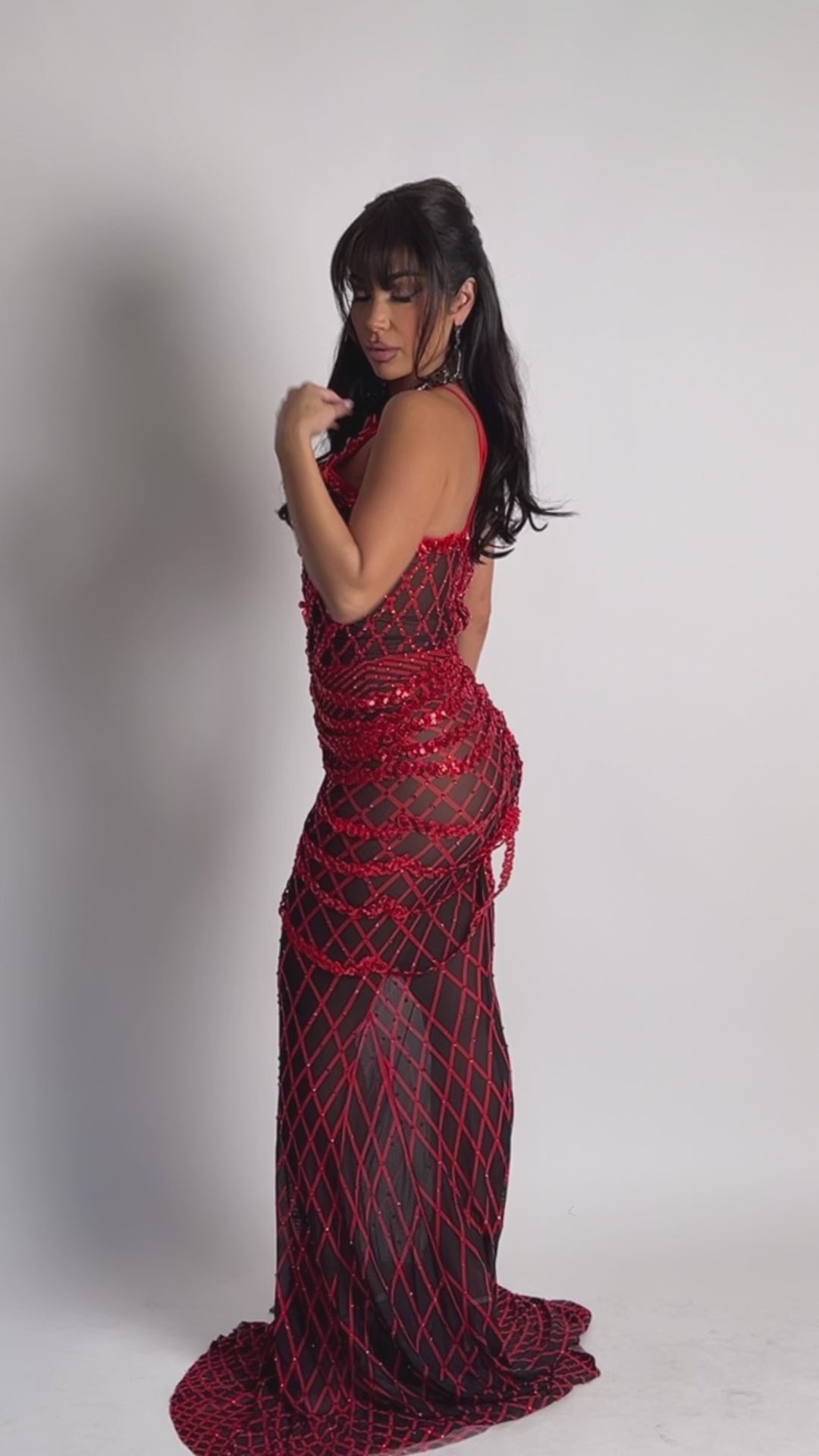 Poppy Princess - Rhinestone Sheer Long Dress. Flowy Long Dress with Delicate Stones