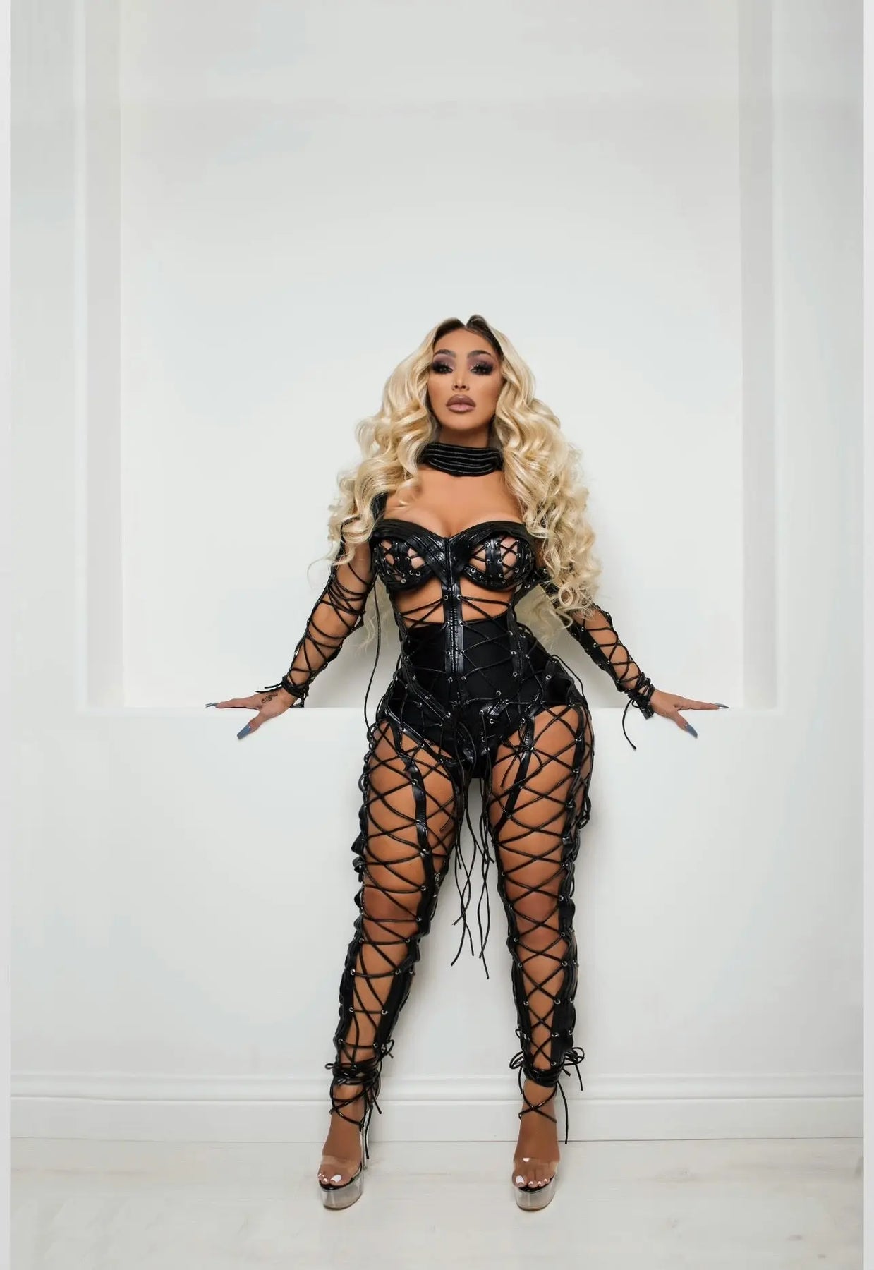 ⚡Turn heads and steal the night in our "After Hours" lace-up jumpsuit. This sultry stunner is made from sleek black vegan leather and features a fully adjustable corset-style lace-up design from bust to toe. Every inch is engineered to sculpt your body like a second skin, while letting you choose how much to reveal. This is femme fatale energy—unapologetic, bold, and built for the spotlight. This is a hand made garment, and cannot be rushed. Please allow 3-4 weeks in most cases, before it ships. Order in advance.