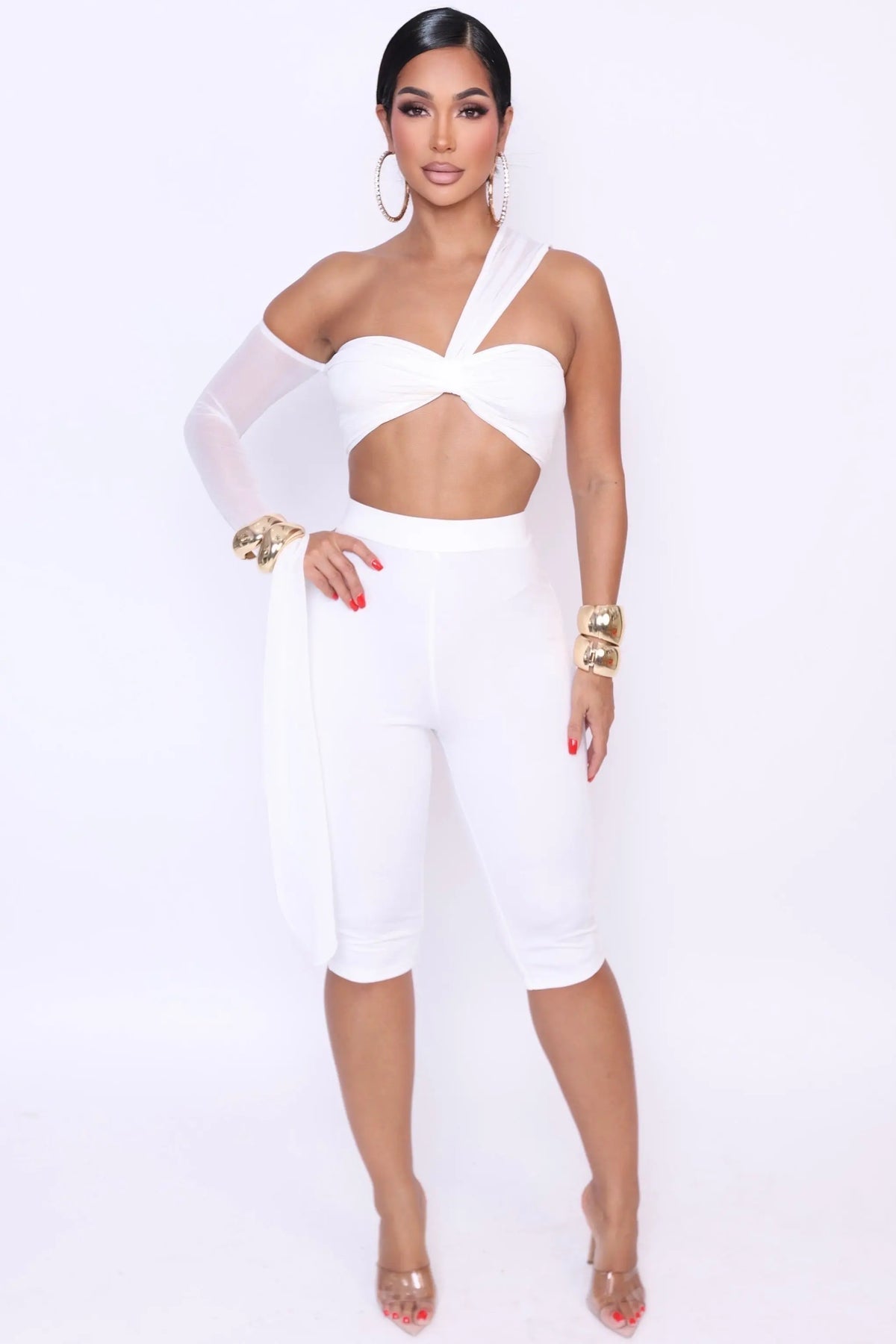 Asymmetra High-fashion drama meets modern minimalism. The Asymmetra Set is designed for the fearless trendsetter who isn’t afraid to command attention. Featuring a bold one-shoulder silhouette, twisted bandeau detail, and sheer draped sleeve, this look delivers avant-garde allure with a sleek, body-sculpting fit.