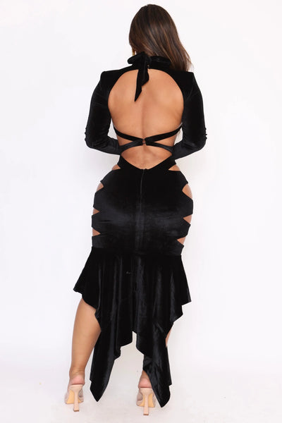 Step into sophistication with Ceremony — a velvet midi dress that defines elegance with a daring twist. This body-hugging silhouette features long padded sleeves, sensual side cut-outs, and a fully open back that ties at the mock neck for a dramatic, unforgettable finish. Perfect for upscale events, birthdays, or red carpet moments, this look is refined, polished, and undeniably bold.