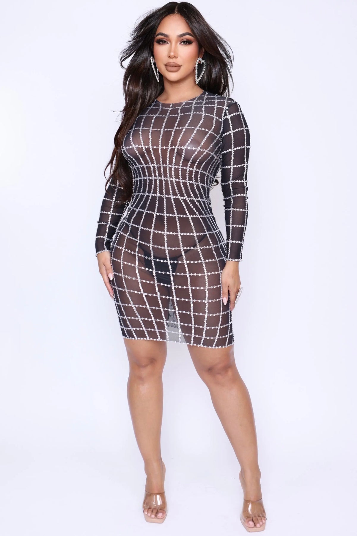 Transform into a glamorous Hollywood star with our Hollywood Squares dress! Adorned with sparkling crystals and crafted from black mesh, this dress will make you shine and stand out from the crowd. Get ready to turn heads and steal the spotlight at any event!