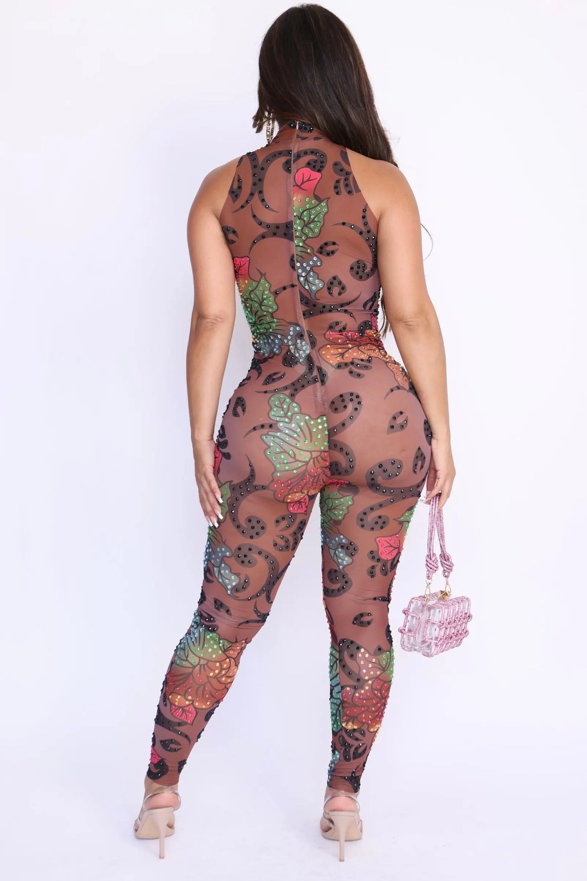 - Features floral printed mesh embellished with matching rhinestones, zipper in back.