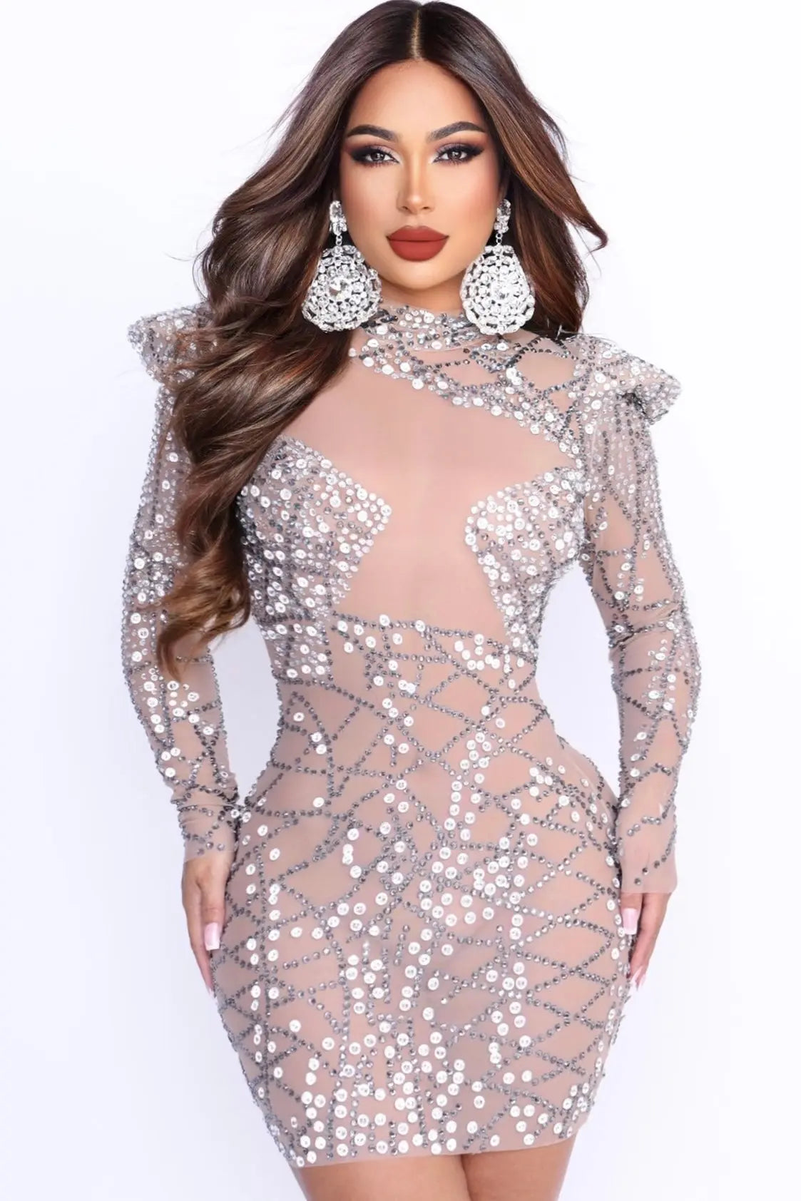 Introducing Quest, a printed mesh dress with padded shoulders and embellished stones for a delicate, glamorous look. The lightweight design provides comfort while the mesh fabric offers breathability. The dress must be worn with care, as it is partially see through.