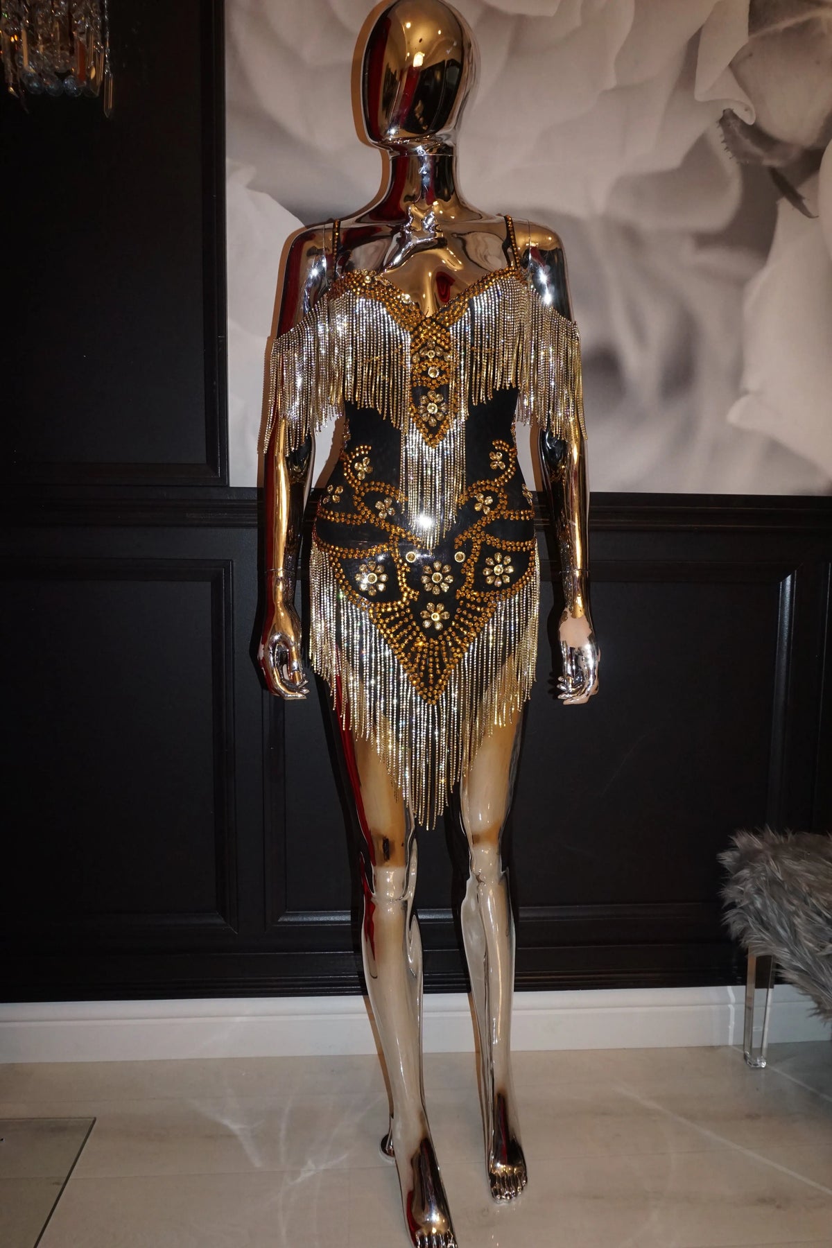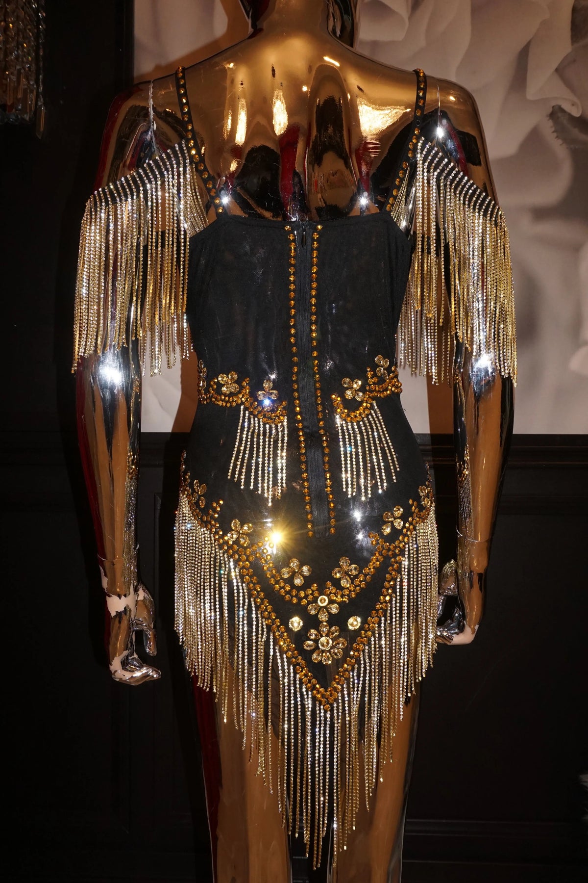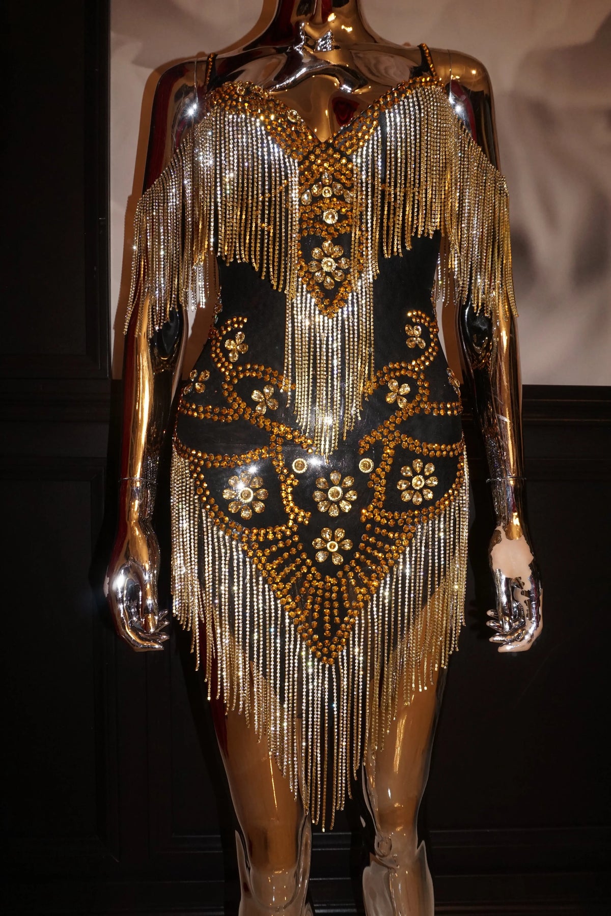 Turn heads and command the spotlight with Vengeance, a jaw-dropping black mesh mini dress drenched in golden rhinestones and crystal fringe. A statement piece that radiates glamour, power, and undeniable confidence.
