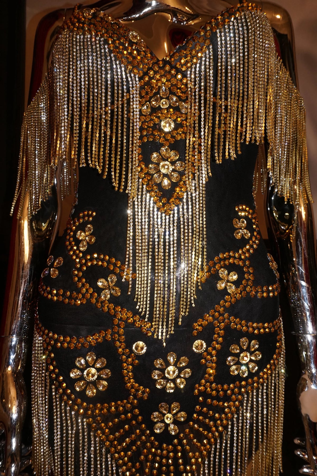 ✅ Black mesh base fully adorned with gold rhinestones & crystal fringe