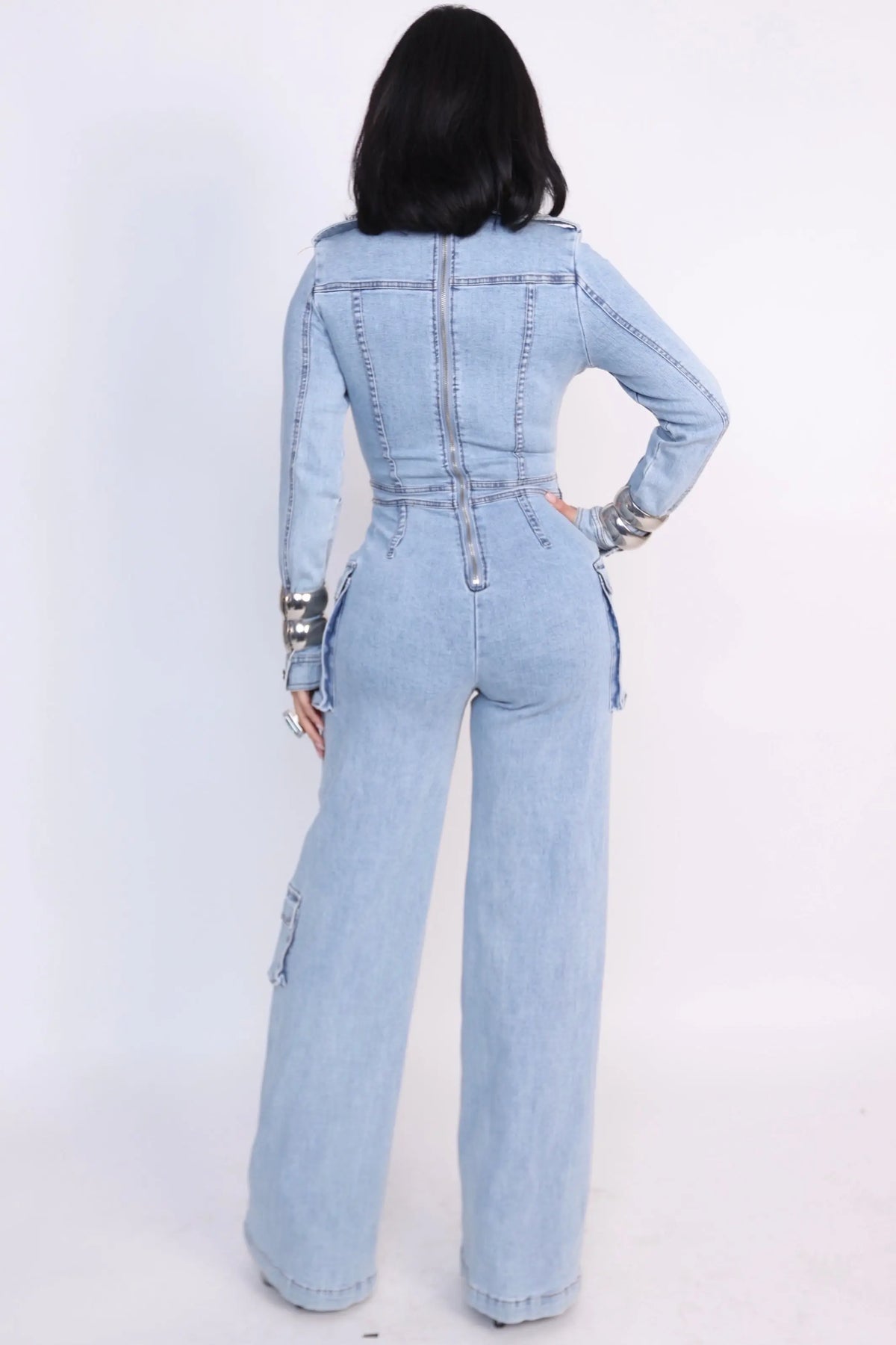The long sleeves, wide-leg silhouette, and utility-inspired pocket accents bring a confident, fashion-forward edge, while strategic seaming enhances and contours the body. Finished with a center back zipper, this jumpsuit blends strength and femininity in one unforgettable design.