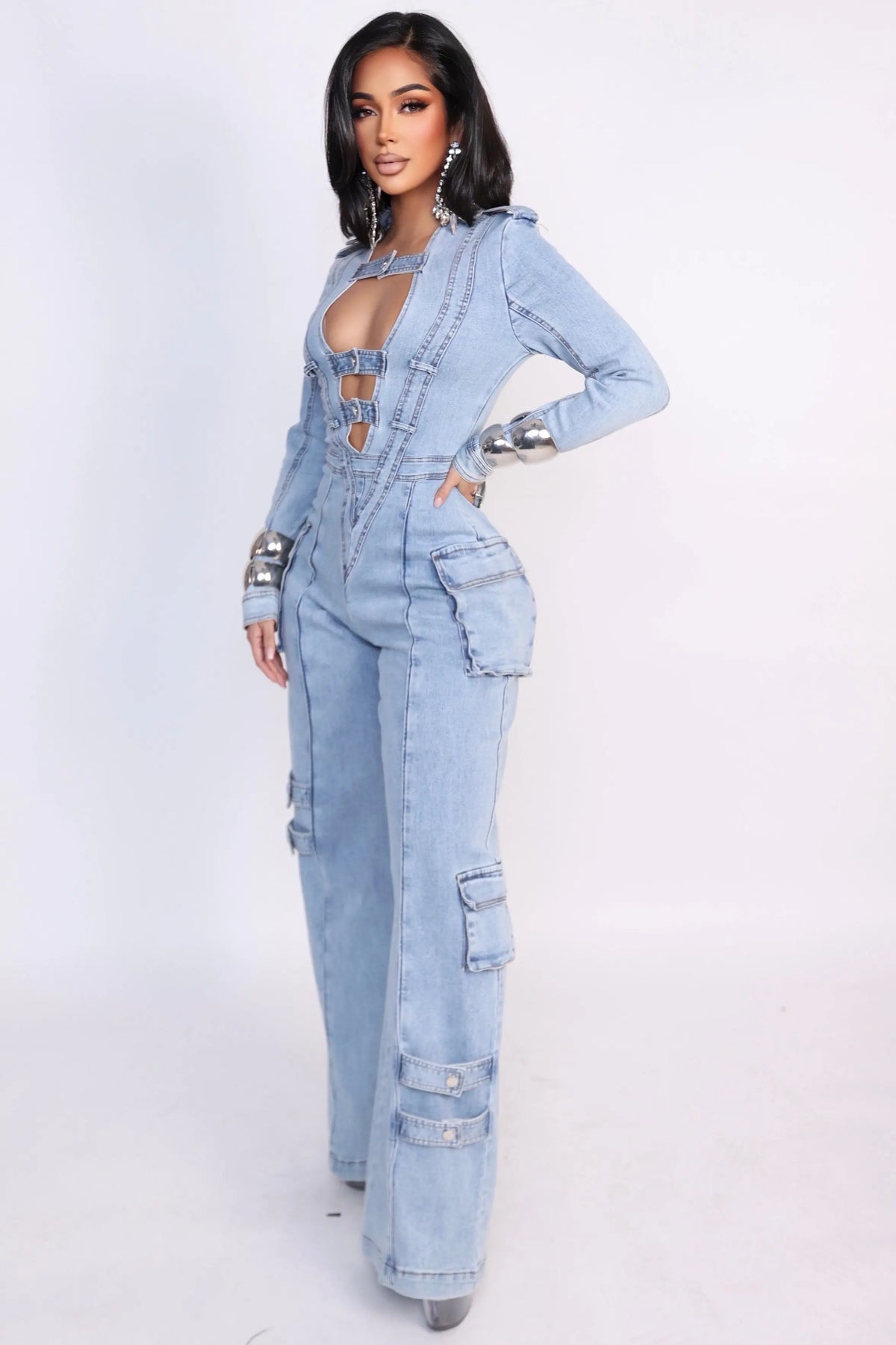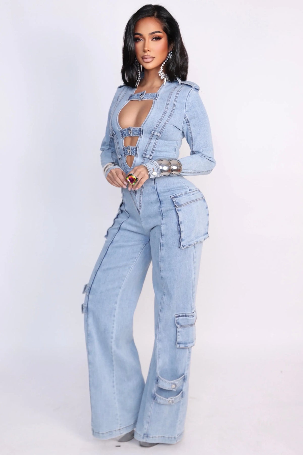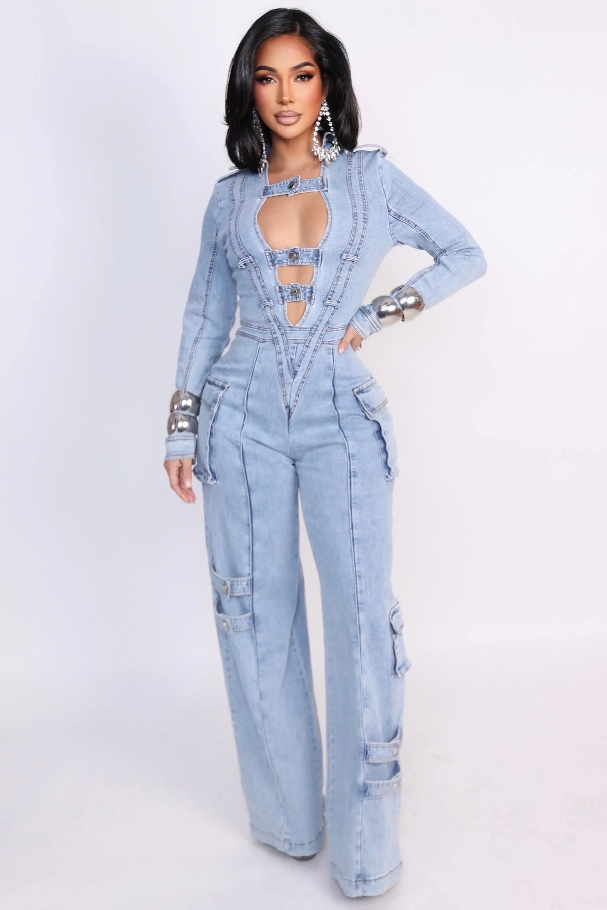 Step into power with Denim Dominance, a statement jumpsuit designed to command attention from every angle. Crafted from structured yet comfortable light-wash denim, this piece features a striking plunging cutout neckline with bold strap detailing that creates an edgy, sculpted look.