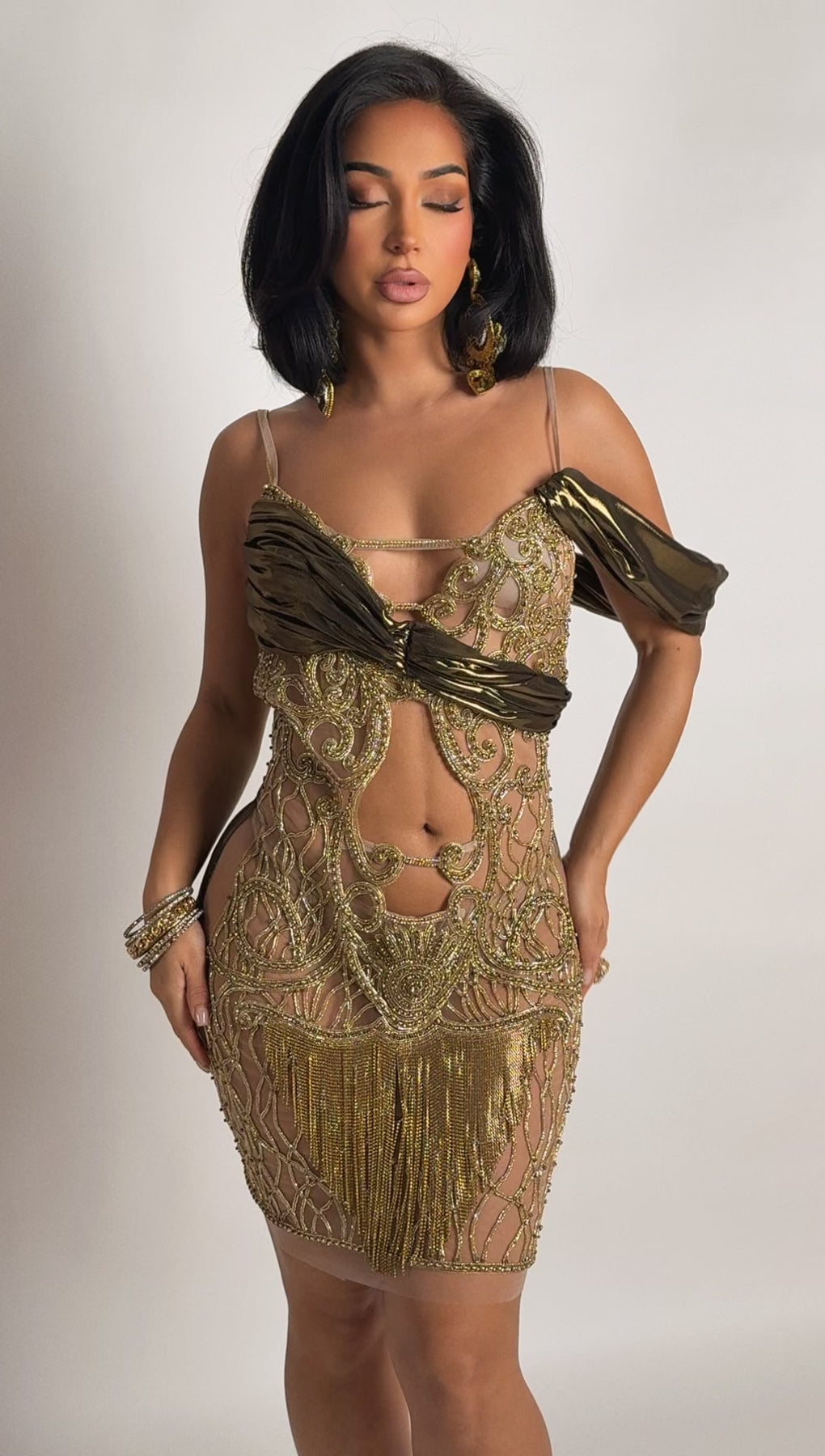 L605 is a striking statement piece designed for nights that call for undeniable glamour. This fitted mini dress features a rich metallic gold stretch base with sheer illusion mesh panels intricately embroidered in shimmering gold detailing. The front showcases ornate beadwork and fringe accents that move beautifully with every step, while the back contrasts with a smooth, high-shine metallic finish for a sculpted silhouette.