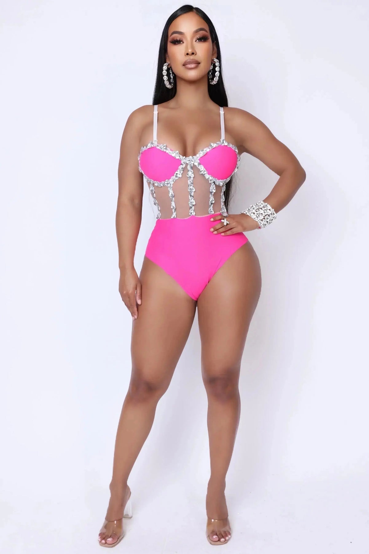Turn the heat all the way up with Citrus Candy — a sparkling bodysuit designed for the daring. This sultry showstopper features a mesh torso with cascading crystal strands, creating an illusion that’s sexy and sculpted. With structured neon cups and a high-waist bottom in either bold pink or electric green, this design screams glam from every angle. Adjustable straps and a back zipper keep the fit secure, while the sparkle does all the talking.