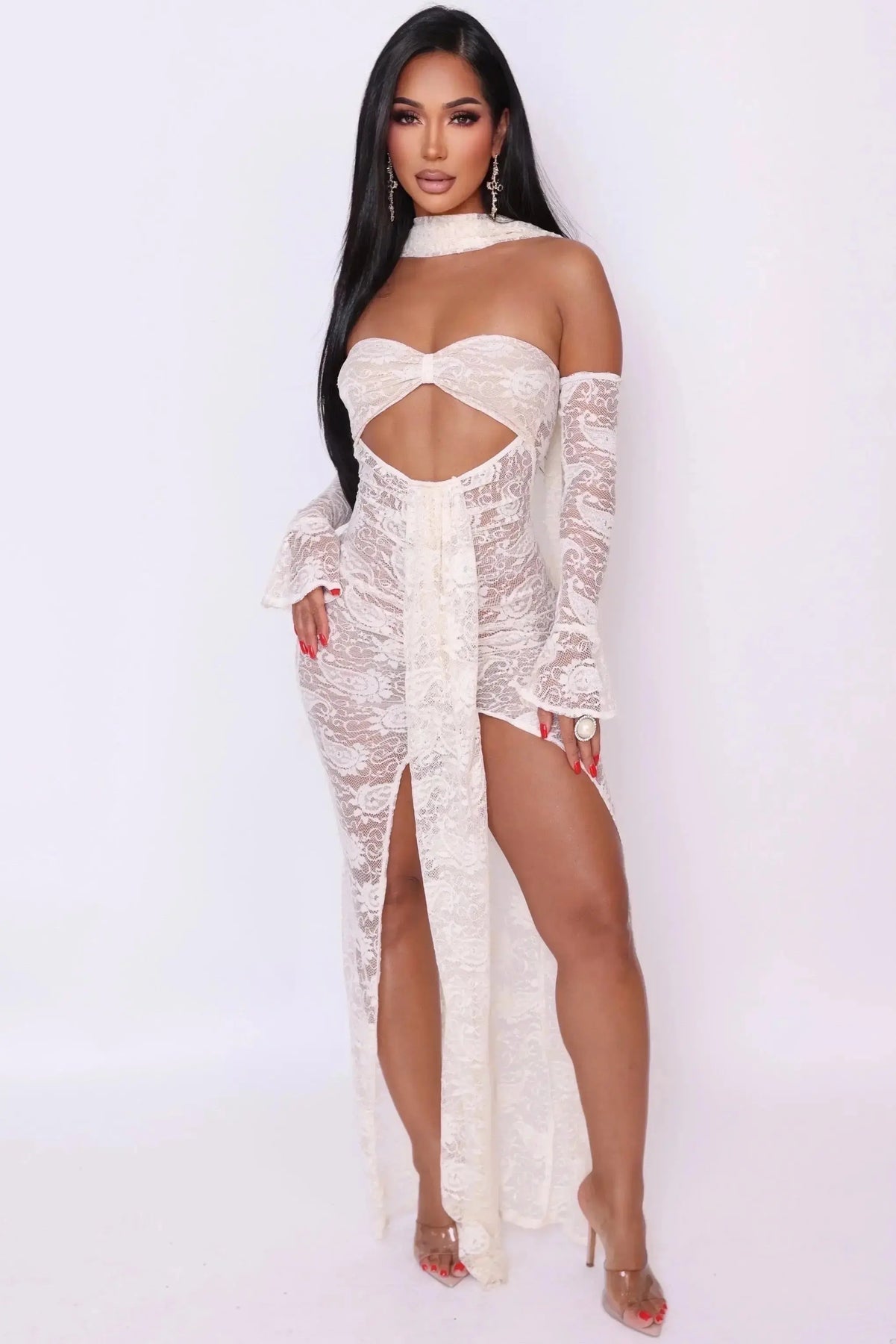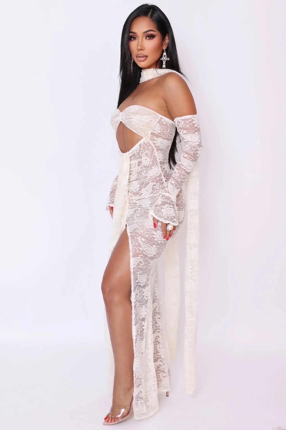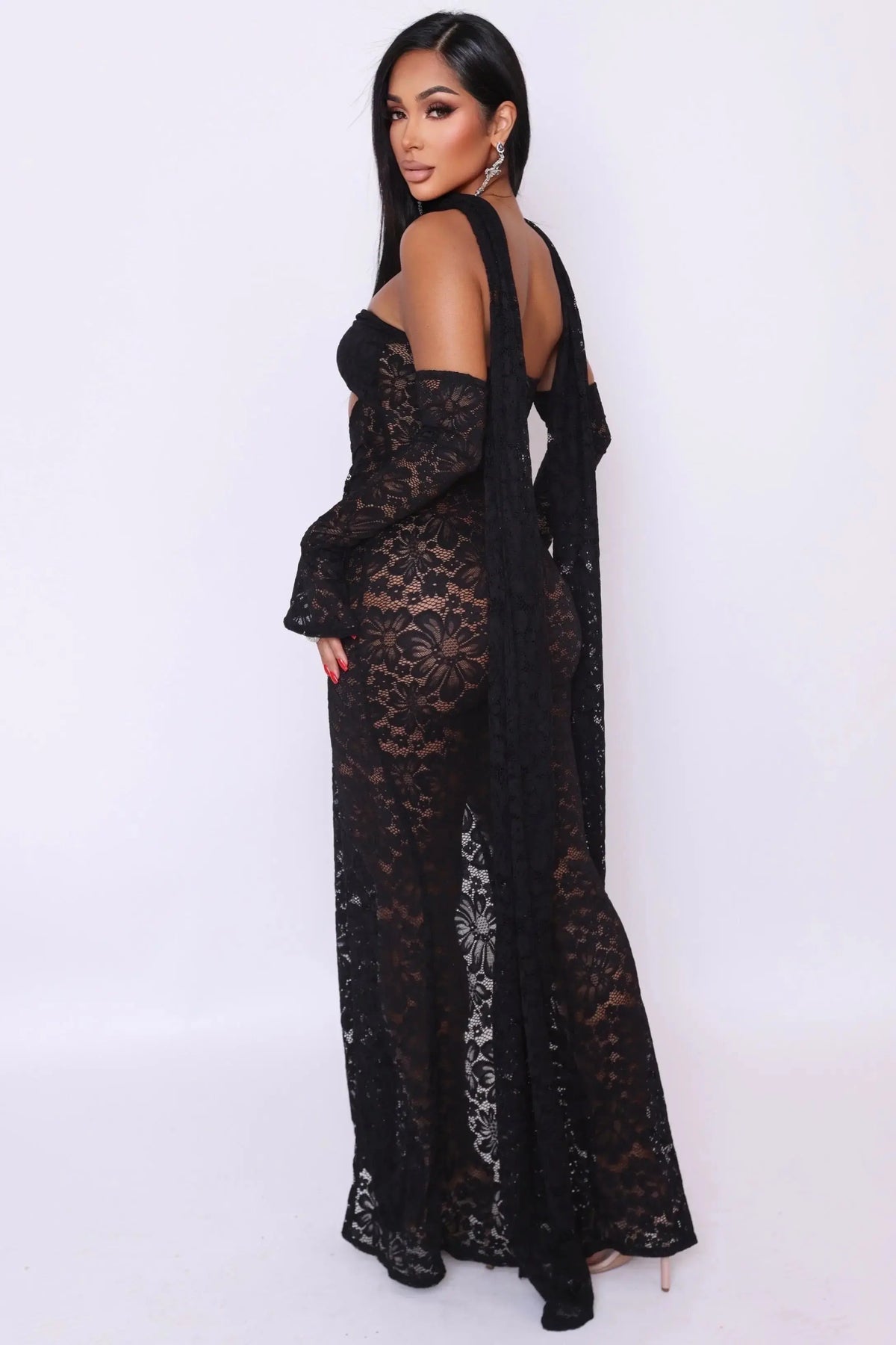Channel your inner goddess with the Selene Lace gown — a mesmerizing piece where delicate lace meets daring design. Perfect for moonlit nights, destination getaways, or red-carpet moments, this look celebrates femininity, elegance, and bold glamour. Yes gloves are included!
