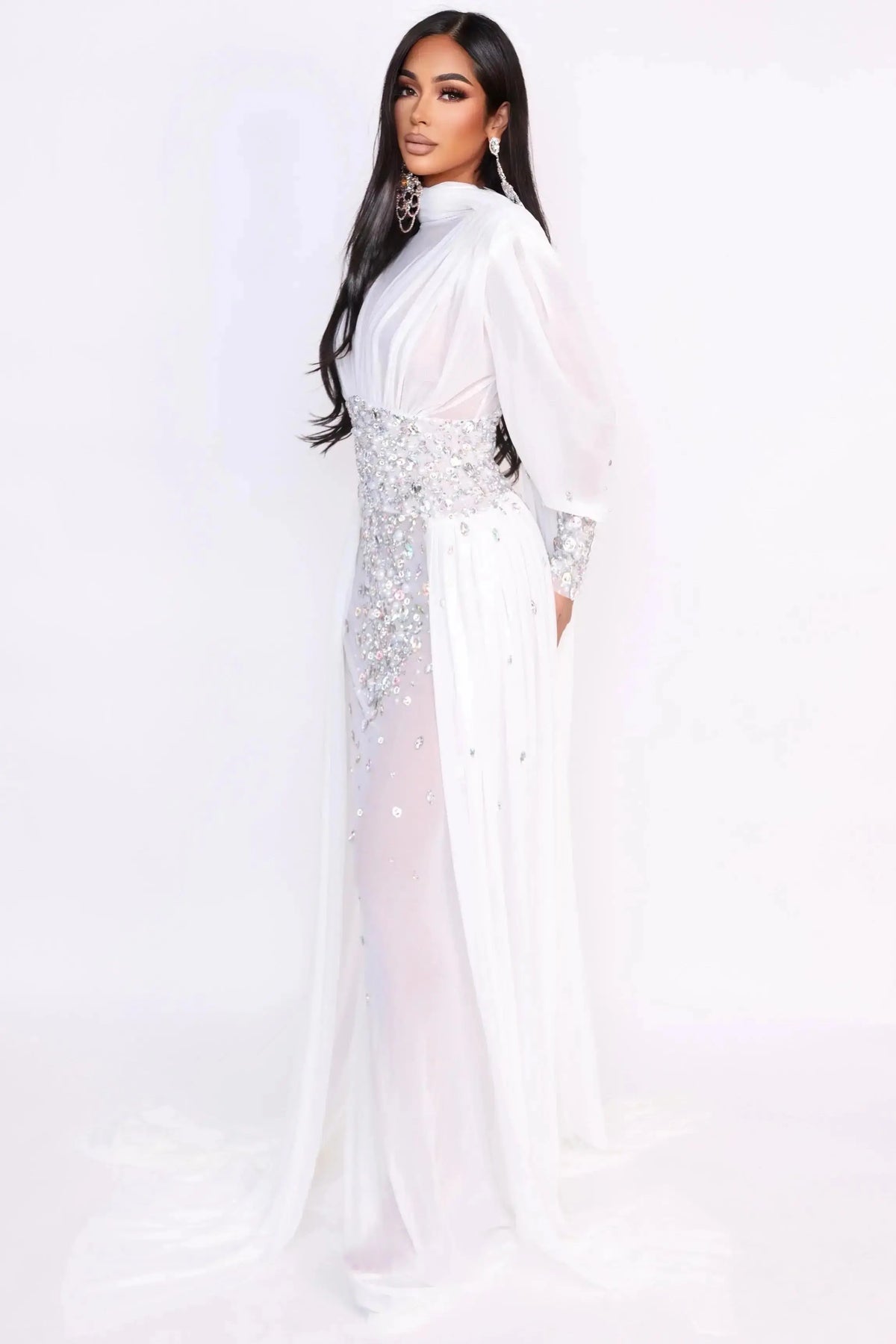 Step into Vivara — a made-to-order masterpiece that captures light, grace, and strength in equal measure. Designed for the woman who commands a room with quiet power, this gown drapes effortlessly in sheer mesh, adorned with luminous AB and clear crystals that shimmer like constellations. The structured turtleneck, plunging V-back, and floor-length cascading panels create an angelic yet commanding silhouette.