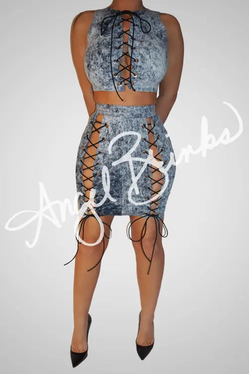 Meet Jeanie — the ultimate statement two-piece denim set that transitions seamlessly from day to night. Designed with lace-up details on both the crop top and skirt, this set allows for a custom-adjustable fit that flatters every curve.