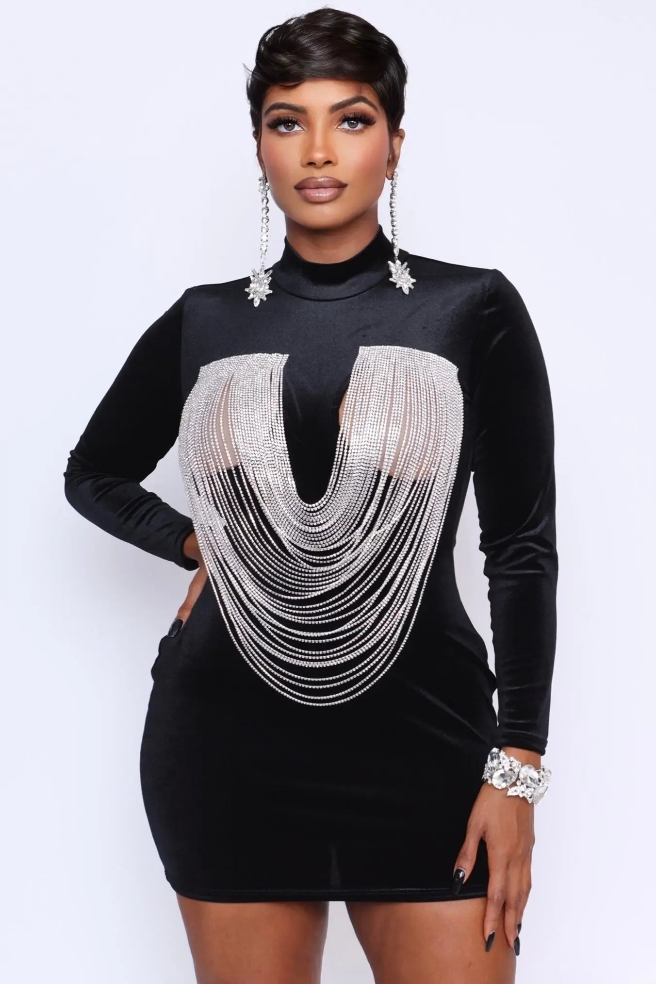 Indulge yourself in the ultimate party dress with Layana. Crafted in luxe black velvet with daring mesh cut-outs, this dress blends comfort and seduction effortlessly. Flirty rhinestone fringe tassels drape over the cut-outs, catching every flicker of light while you move. With its form-fitting design and long sleeves, Layana is both eye-catching and elegant — the perfect piece for the modern woman who loves to be the star of the show.