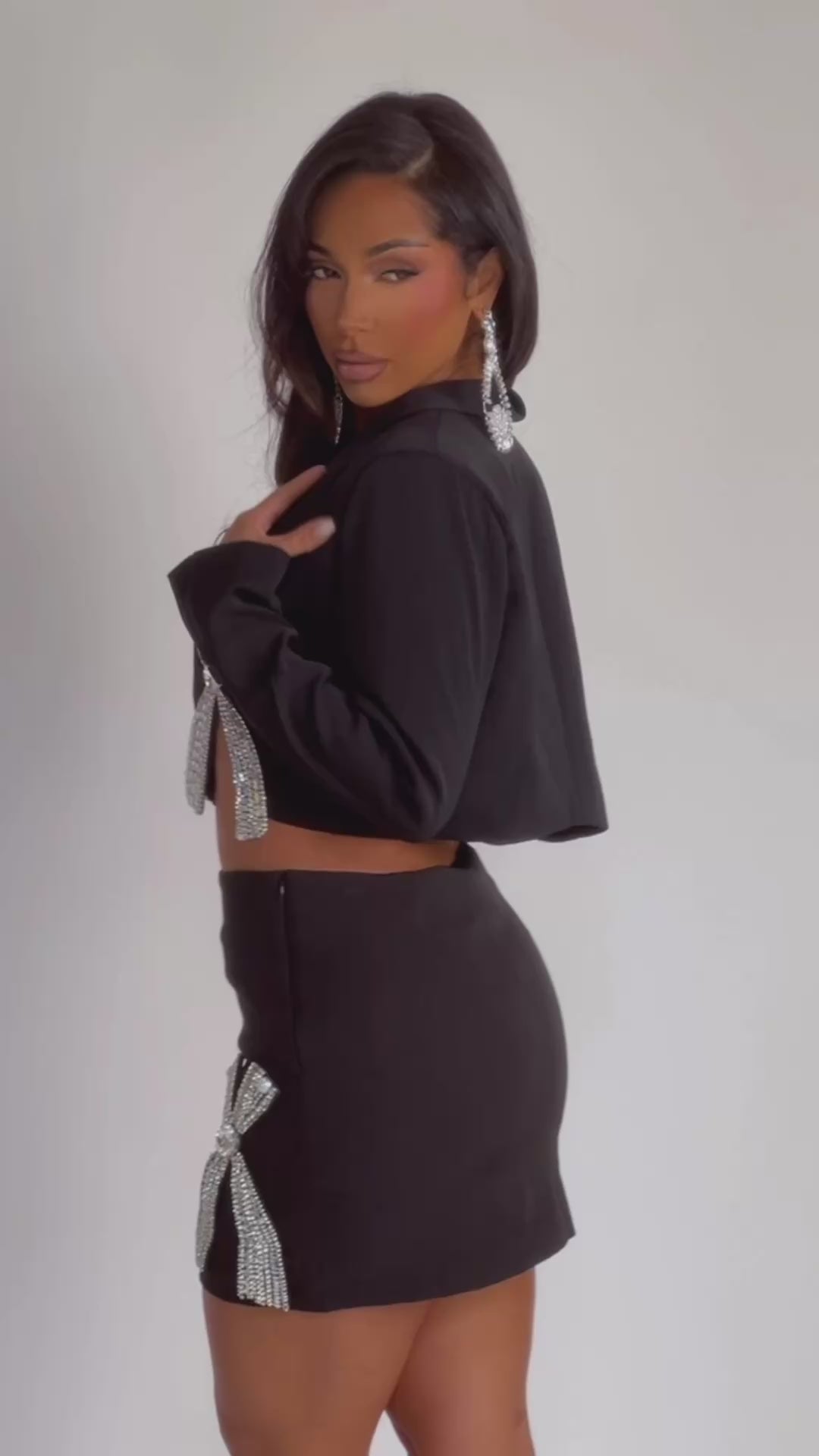 Level up your look with Femme Frame, the ultimate power-meets-glam 2-piece mini set. Crafted in sleek black fabric and decked with shimmering rhinestone bow accents, this boss babe ensemble blends feminine edge with major sparkle.