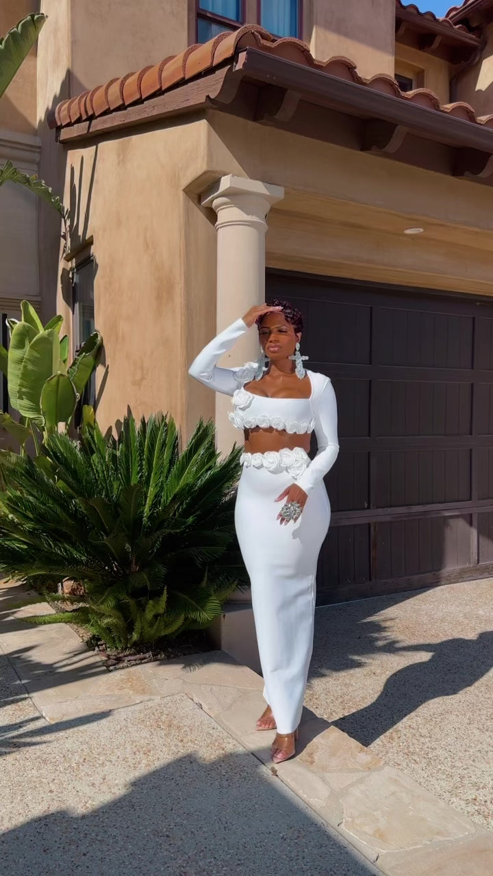 Step into a world of elegance and sophistication with Fiona — a stunning two-piece set crafted for the modern muse. Featuring delicate floral detailing and a sleek, body-contouring bandage material, this luxurious ensemble highlights your curves with effortless grace. The fitted pencil skirt with a back slit adds just the right amount of drama, making Fiona perfect for elegant evenings, galas, and moments when you need to captivate the room.