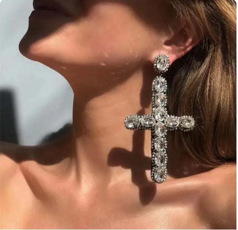 Embrace your bold and confident style with our stunning silver big cross earrings! Adorned with dazzling stones, these earrings will add a touch of glamour to every outfit. Elevate your look and make a statement with these unique and eye-catching earrings.