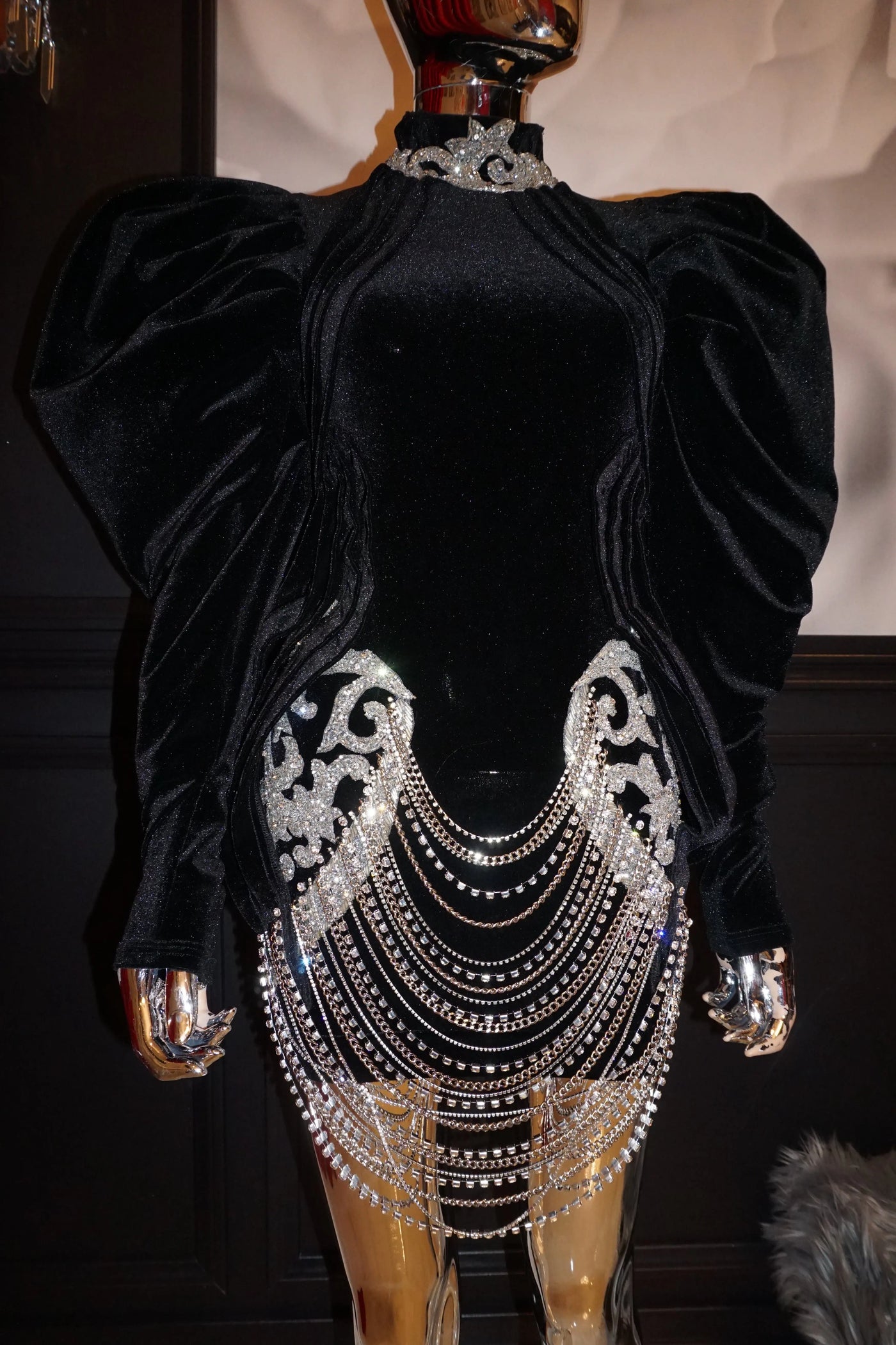This dress brings the drama and keeps the sexy with enhanced padded shoulders and forearms, crystals around the neck, at the hips and crystal chains across the hips. Black straps on each hip to accentuate your curves. Zipper up the back ensuring that the piece is easy to get in and out of. Stretch is minimal, please order true to size.