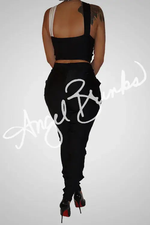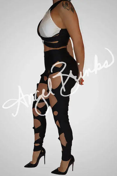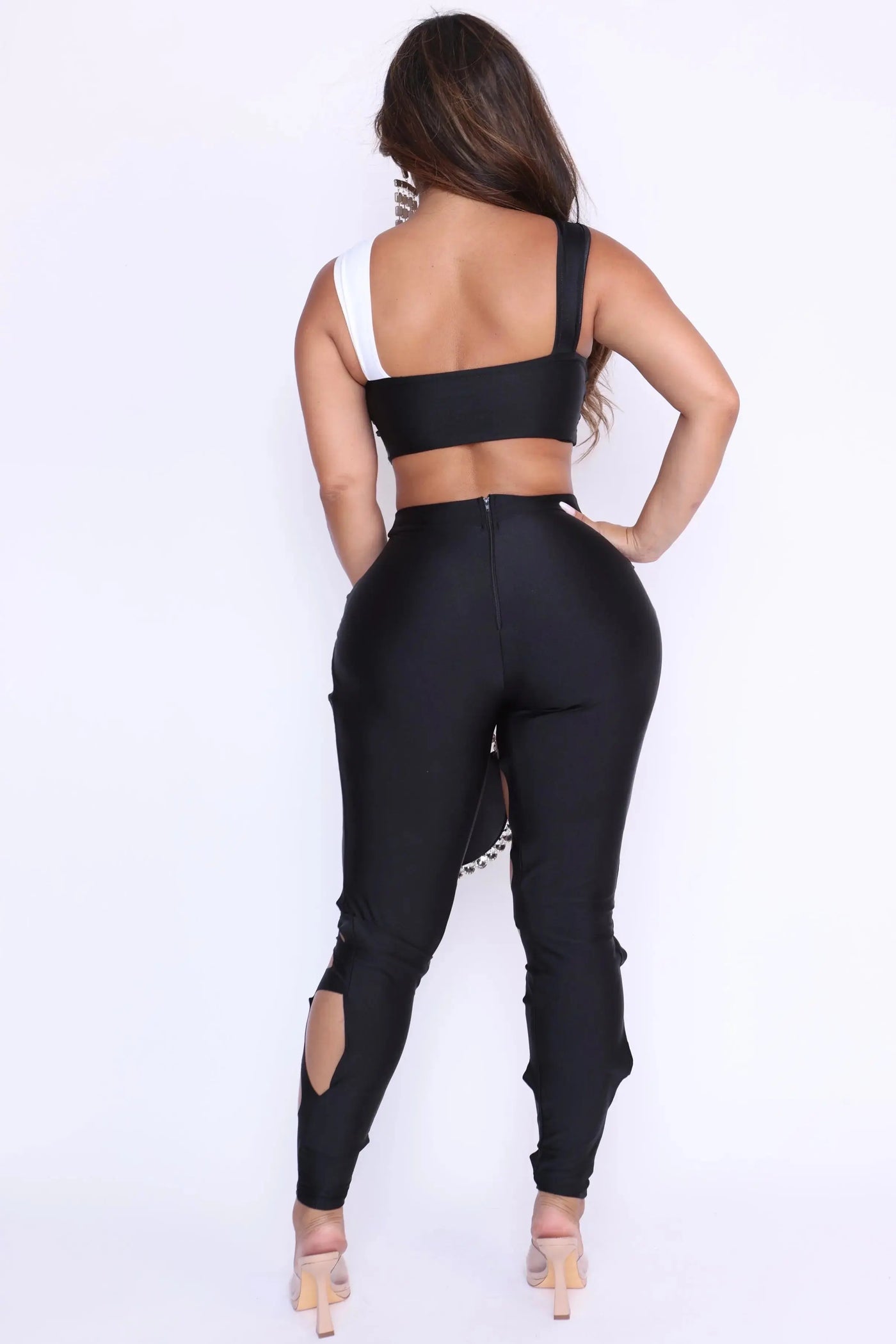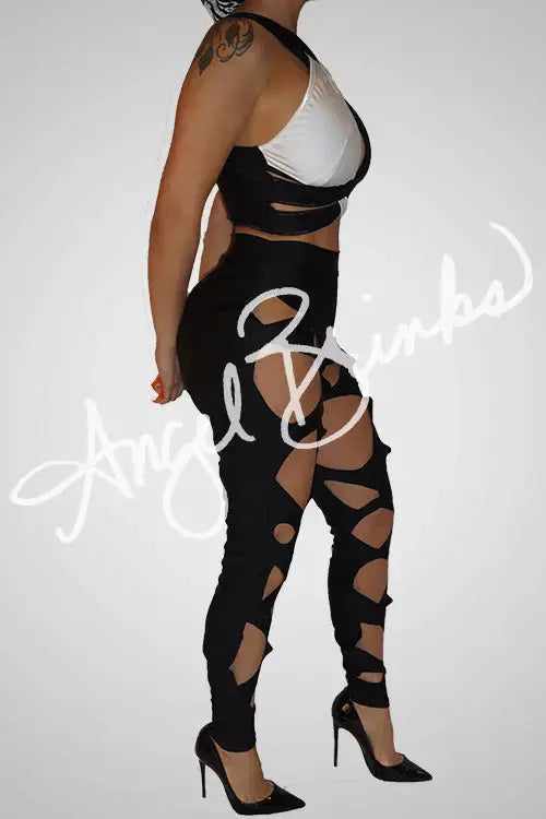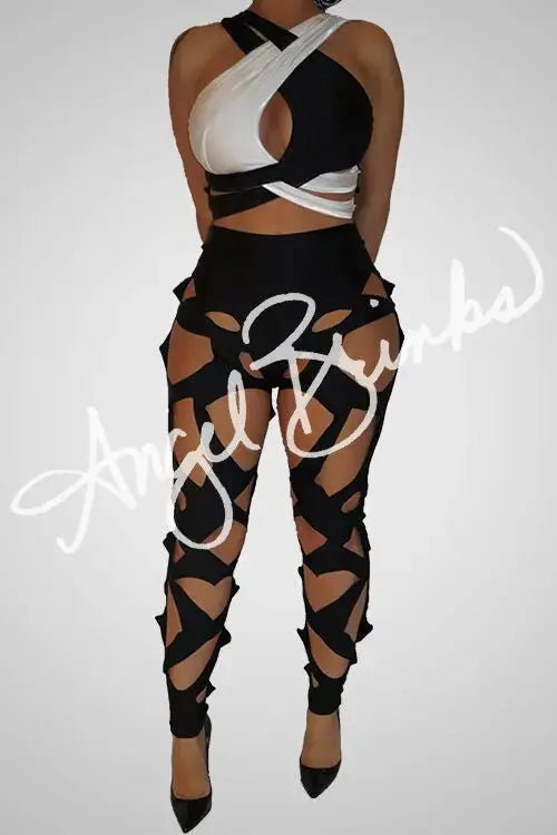 Introducing Deja—a head-turning, edgy two-piece that redefines bold. Featuring a black and white asymmetrical crop top with keyhole detailing and a twisted wrap effect, paired with ultra-daring high-waisted cutout leggings. This look is not for the shy—it's for the confident, the fearless, the unforgettable.