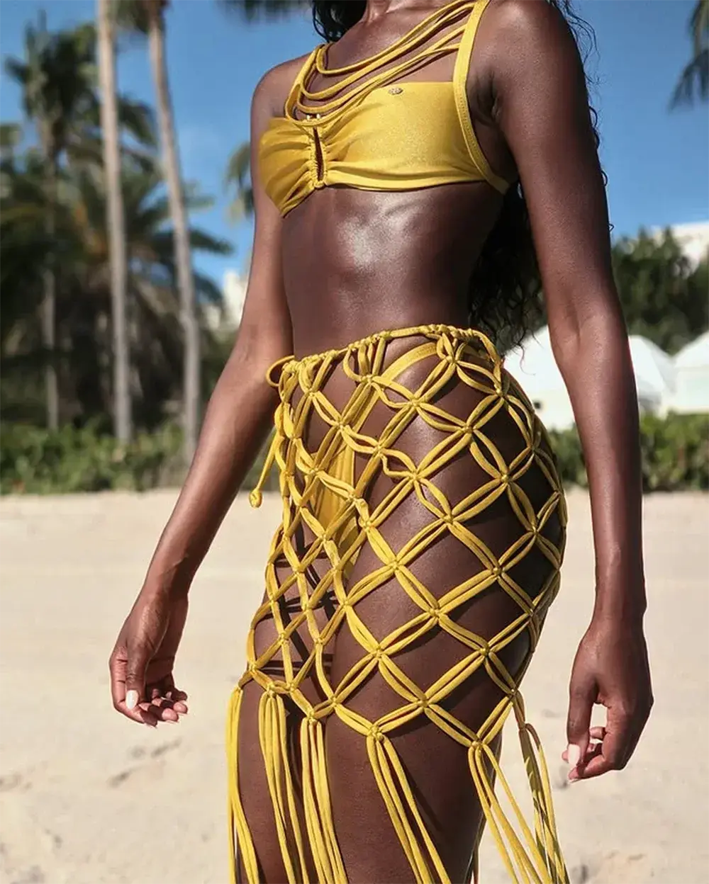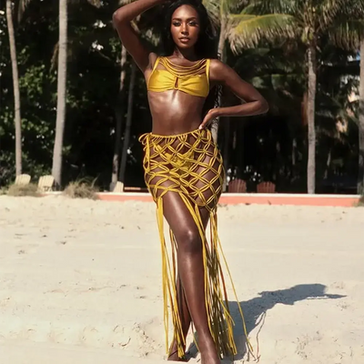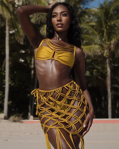 • Artisanal Texture: Mustard‑hued macramé sarong—intricate net weave and long tassel fringe for real movement
