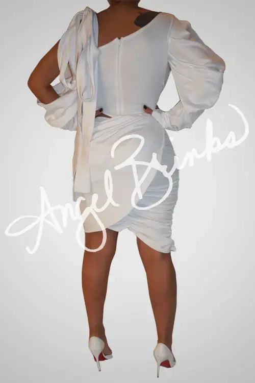 Statement sleeves: one long sleeve with voluminous ruching and a bold shoulder cut-out, while the other side is left sleeveless for a striking contrast.