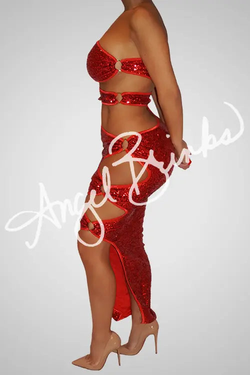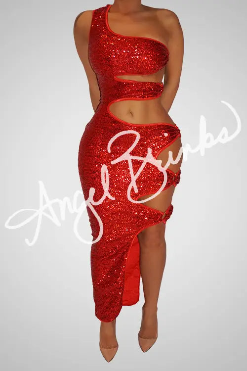 Glamorous red sequin dress will have you lookin luxe through the after hours! Catch their eyes at that entrance while wearing this super sexy sequin dress featuring a strappy crossbody look.