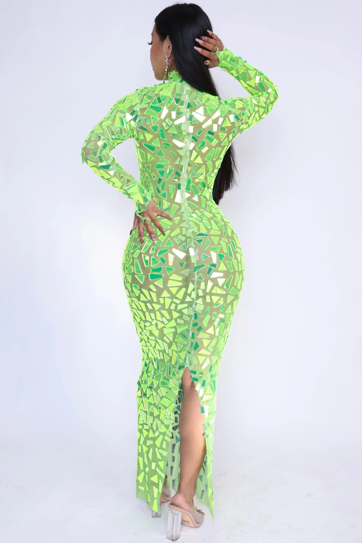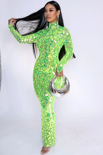 Stand out and embrace bold glamour with the Luck of the Irish dress! This striking piece features a combination of lime green mirrors on lime green mesh that create a mesmerizing, shimmering effect. With its body-hugging fit, this dress is designed to showcase your curves, making it a showstopper at any event.