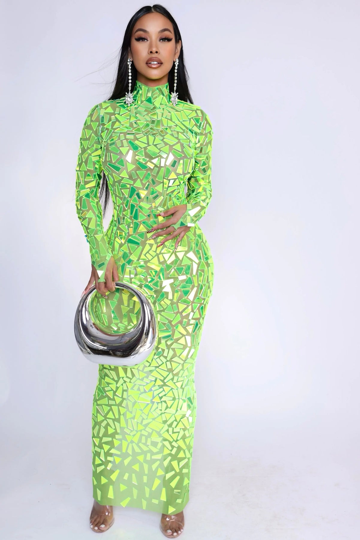 ✔️ Lime Green Mirrors: Reflective mirror pieces on the mesh fabric that create a bold and shimmering design