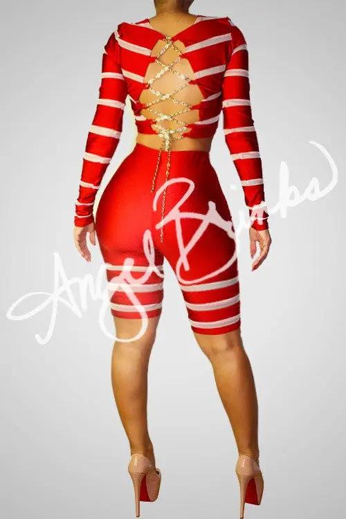 Ok, we know what you're thinking. This set is very time consuming to sew, and we like to be perfect. This set is sewn piece by piece and gold chains are used to accent the back to give this piece the unique, and beautiful design it has. Very tight fitting, true to size so please order your accurate size. The gold chains can be loosened or tightened to your preference.
