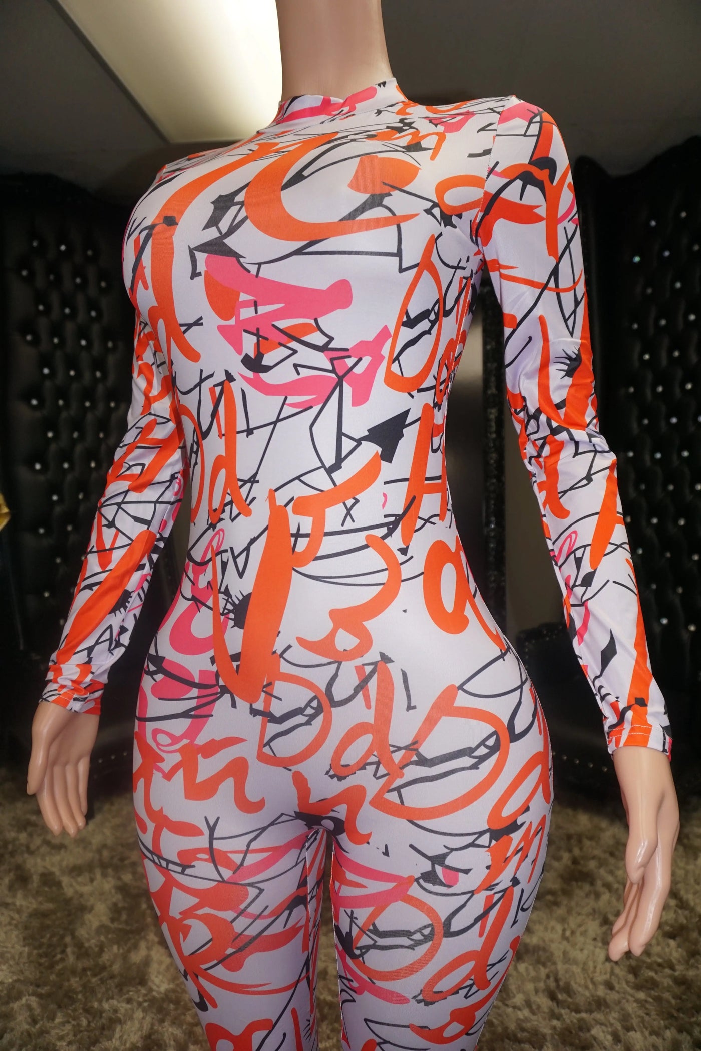 Step into the spotlight with “Opera” — a head-turning bodysuit designed to make an entrance. Featuring bold, graffiti-style abstract print in vivid tones of orange, pink, and black on a sleek white base, this made-to-order piece brings runway energy to real life.